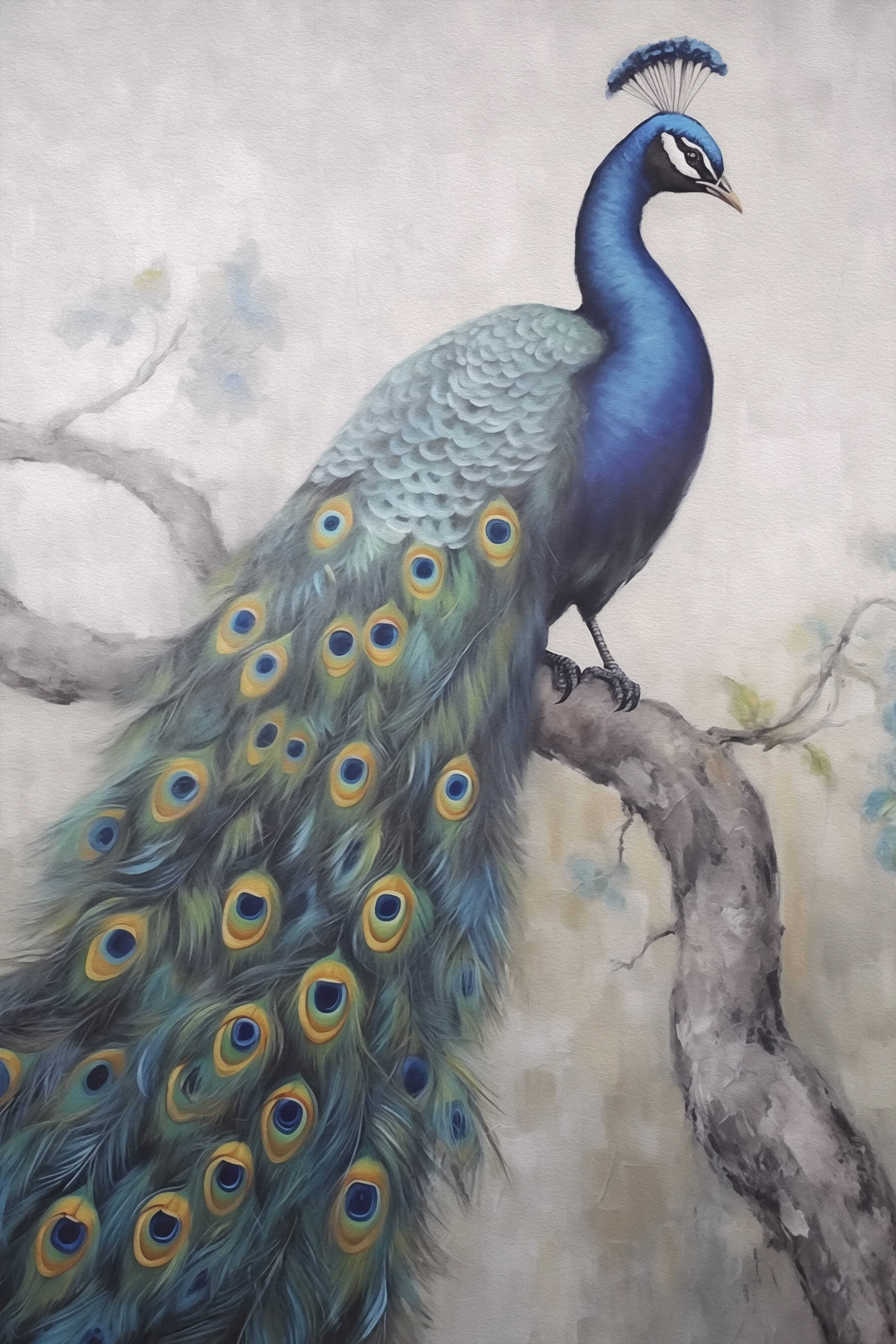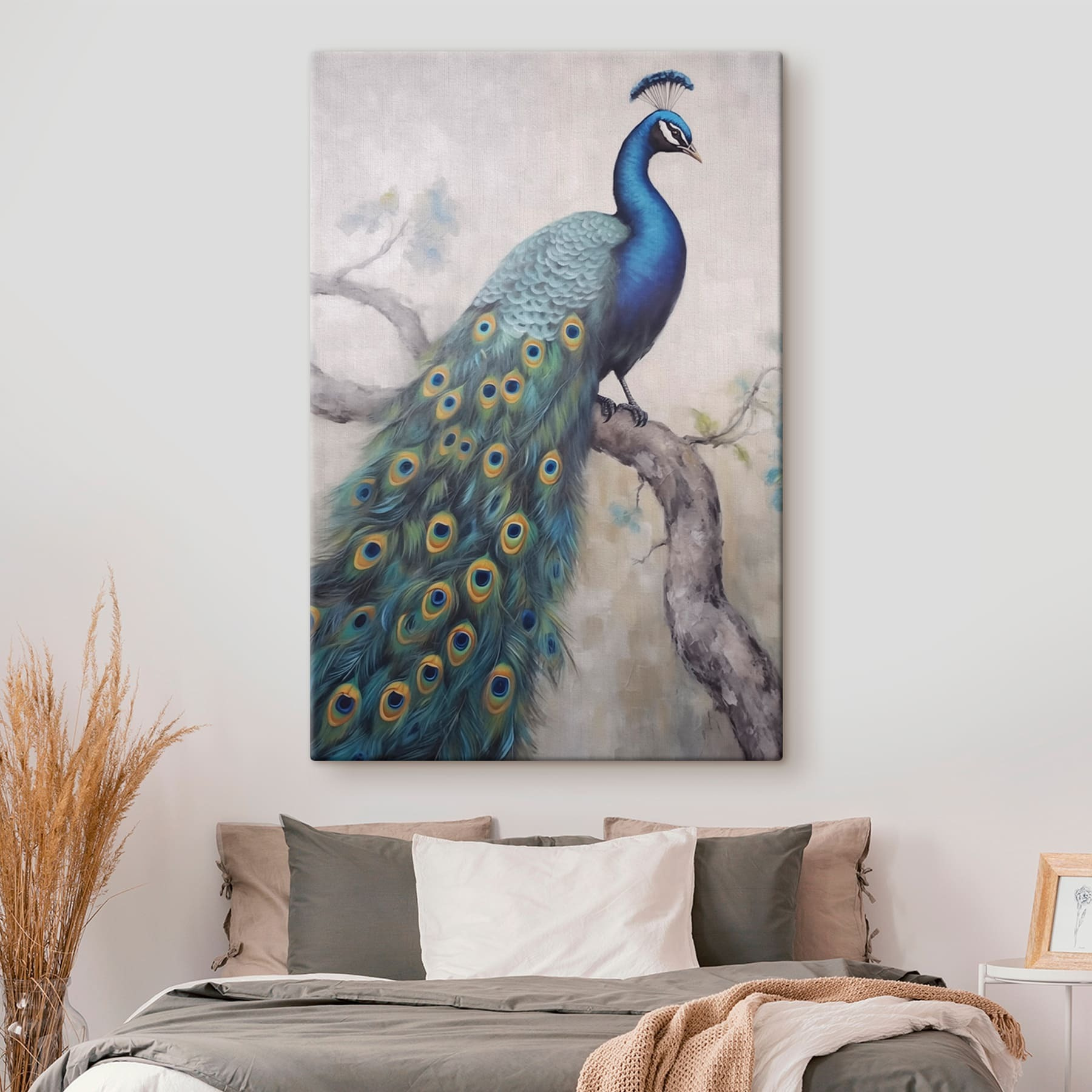 Transformați orice spațiu într-un refugiu vibrant cu această imprimare încântătoare pe pânză a unui păun cocoțat grațios pe o ramură. Nuanțele sale uimitoare de albastru și verde creează un strop de culoare care vă va duce cu siguranță într-o oază de grădină senină. Imaginați-vă această pasăre minunată care se dă în spectacol, aproape provocând pe oricine să nu o admire. Perfectă pentru camere de zi, birouri sau un colț de lectură confortabil, aceasta invită la doze zilnice de inspirație. În plus, cui nu-i place un pic de natură în interior? Captează perfect eleganța vieții sălbatice, oferind în același timp decorului dvs. acea notă fermecătoare, capricioasă.
