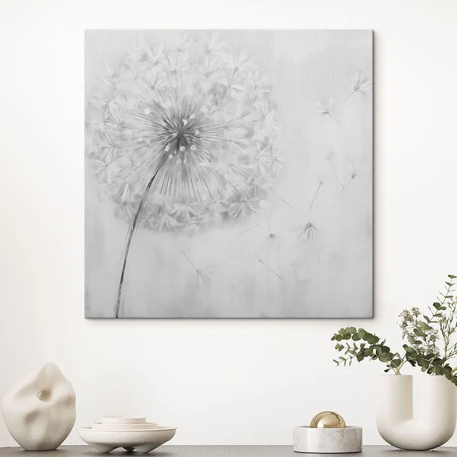 Transformați orice cameră cu această imprimare încântătoare pe pânză care prezintă o păpădie delicată. Nu este doar artă; este un moment înghețat în timp, care surprinde dansul capricios al semințelor care plutesc, fiecare dintre ele fiind o mică dorință lăsată liberă. Imaginați-vă că priviți această piesă în timp ce sorbiți o cafea și simțiți că vă cuprinde o stare de lejeritate, ca și cum posibilitățile lumii sunt doar la o respirație distanță. Perfectă pentru a adăuga o notă de farmec minimalist unui colțișor confortabil sau pentru a înveseli un cadru mai formal. Șoptește seninătate, făcând greu să nu zâmbești. Efort minim, impact maxim!