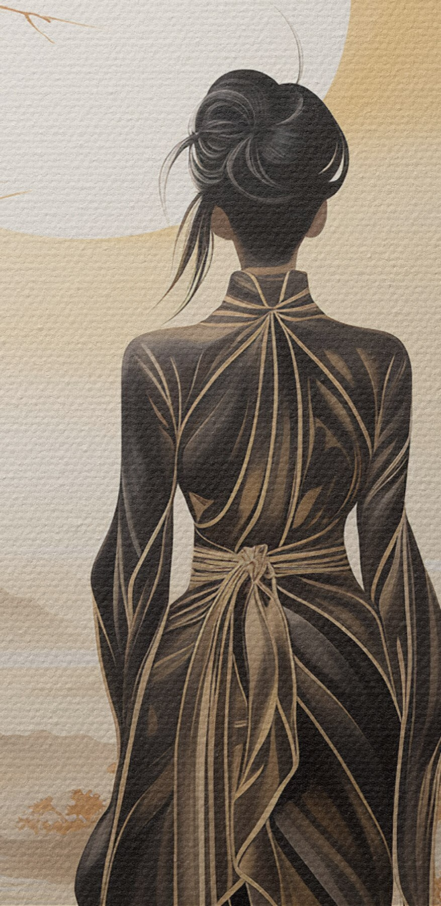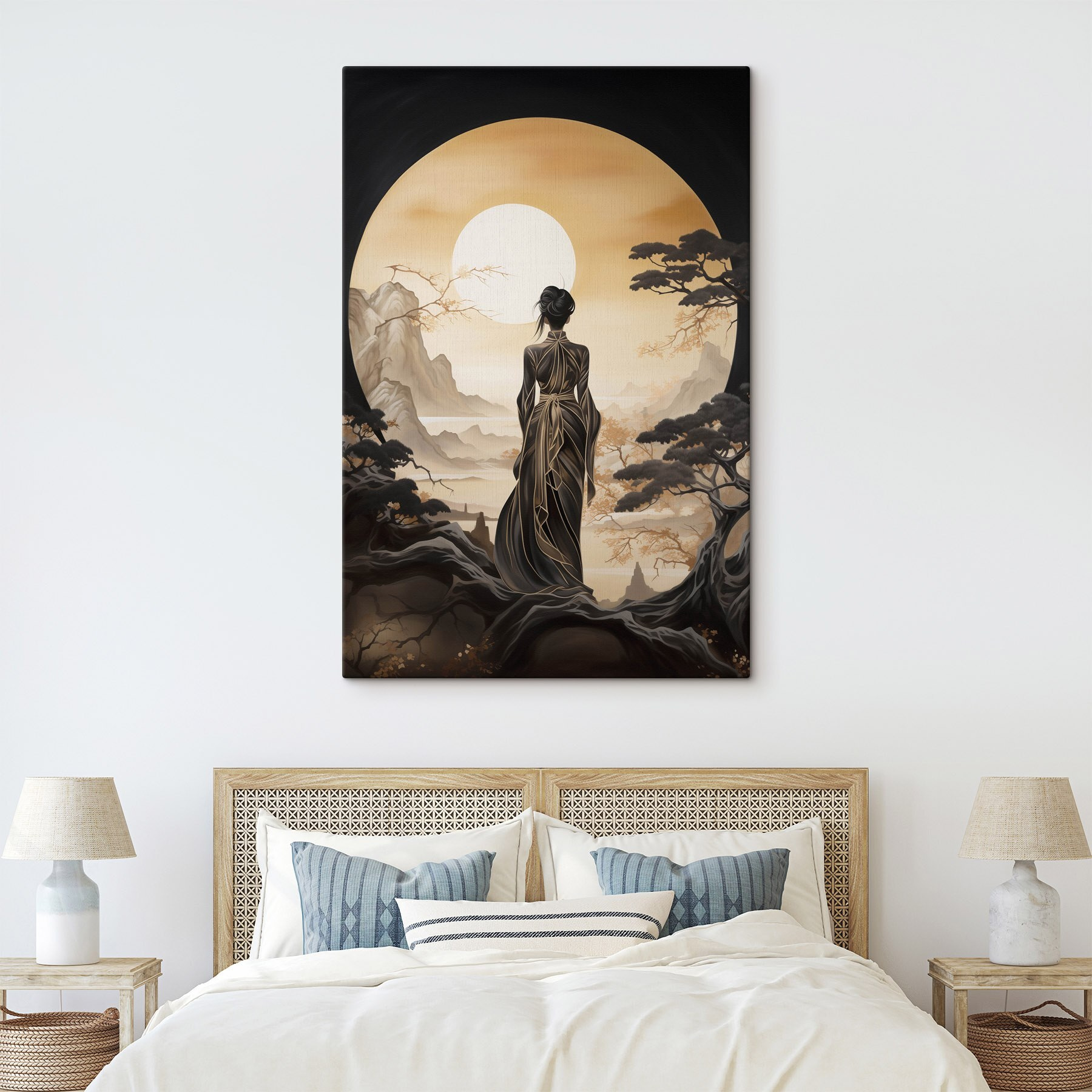 Imaginați-vă că pășiți într-o lume senină în care o femeie într-o rochie fluidă privește soarele, pierdută în gânduri. Această imprimare pe pânză surprinde perfect această magie. Nuanțele calde vă invită să vă relaxați, ceea ce o face un accesoriu excelent pentru orice perete. Imaginați-vă-o împodobind camera de zi sau un colț confortabil, evocând un sentiment de calm și reflecție. Este ca o amintire blândă a momentelor liniștite, poate chiar un imbold să faceți o pauză și să vă bucurați de lucrurile mărunte. Pentru iubitorii de artă sau pentru oricine dorește o notă de eleganță, acest print pare a fi un început de conversație perfect – cine nu ar dori să discute despre frumusețea naturii și poveștile pe care le inspiră?
