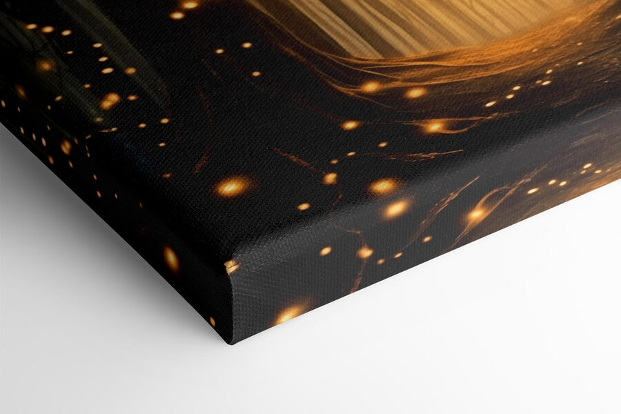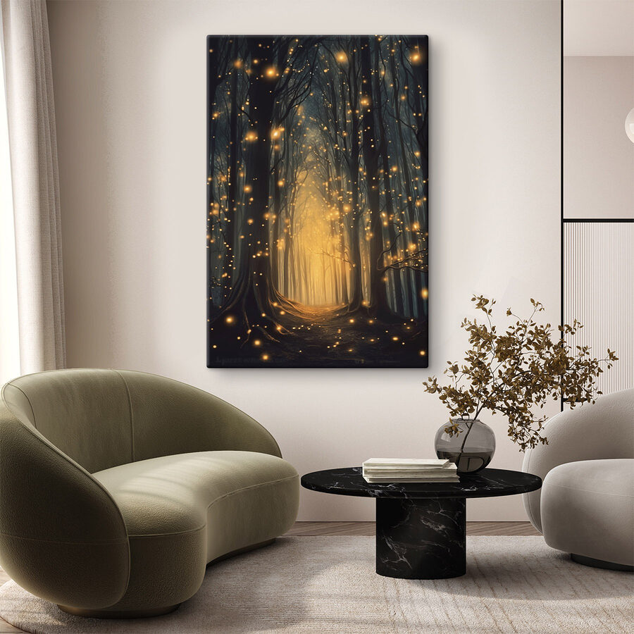 Intrați într-un moment magic cu această imprimare pe pânză, “Cărare printr-o pădure cu mulți copaci cu lumini”. Este ca și cum ai păși într-un basm, unde sferele strălucitoare împrăștie bucurie printre copacii impunători. Imaginați-vă sorbind ceai în timp ce această operă de artă adaugă un strop de uimire camerei dvs. de zi. Creează o atmosferă senină – perfectă pentru conversații confortabile sau gânduri profunde.