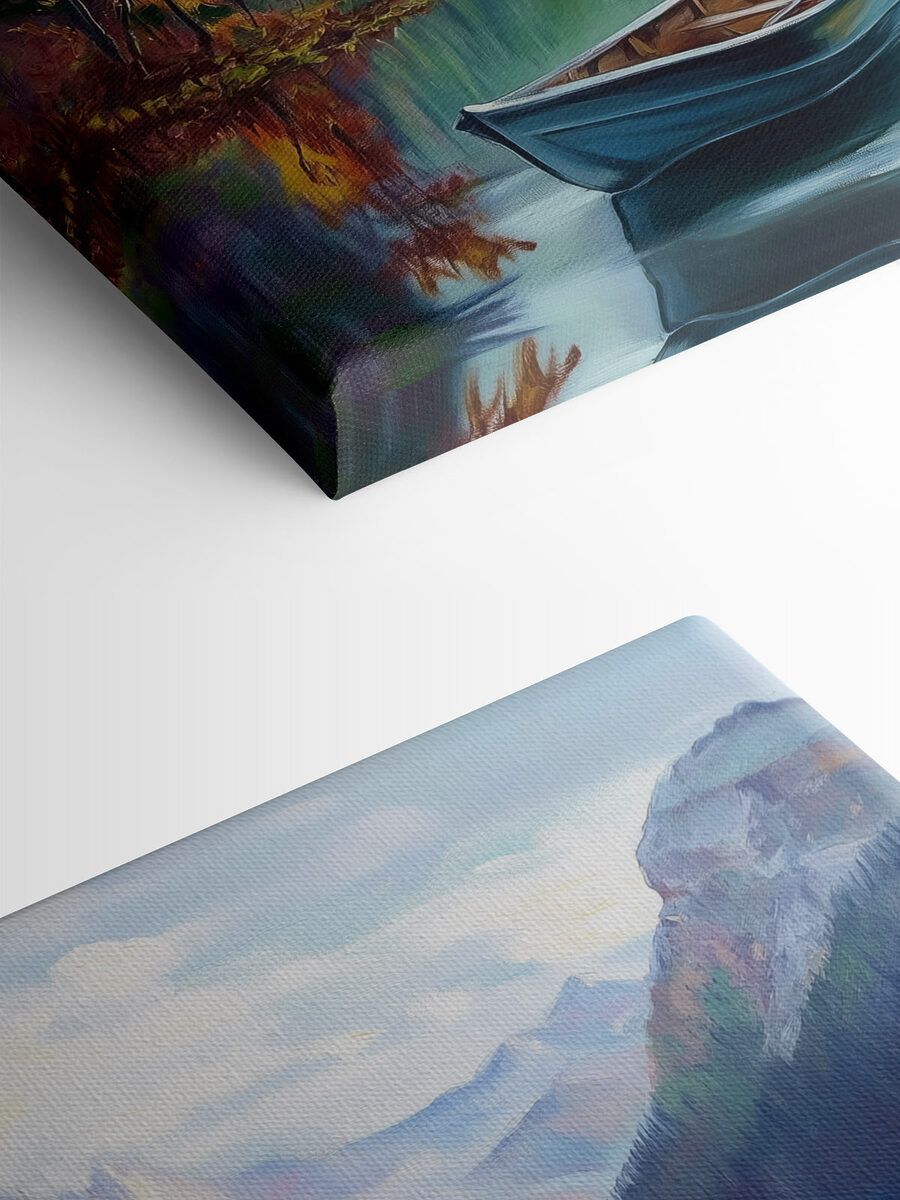 Imaginați-vă că plutiți într-un loc liniștit, unde bătaia blândă a apei se armonizează cu foșnetul frunzelor. Această imprimare pe pânză a unei bărci pe un lac captează acea vibrație pașnică. Culorile blânde și reflexiile visătoare invită la visare cu ochii deschiși, precum acele weekenduri leneșe petrecute relaxându-vă. Imaginați-vă această frumusețe agățată într-un colț de lectură confortabil sau într-un dormitor liniștit – este ca și cum ați avea o felie de natură chiar pe perete. Perfect pentru a inspira un sentiment de calm sau pentru a medita pur și simplu la micile mistere ale vieții. Cine nu ar vrea să se piardă în această priveliște?