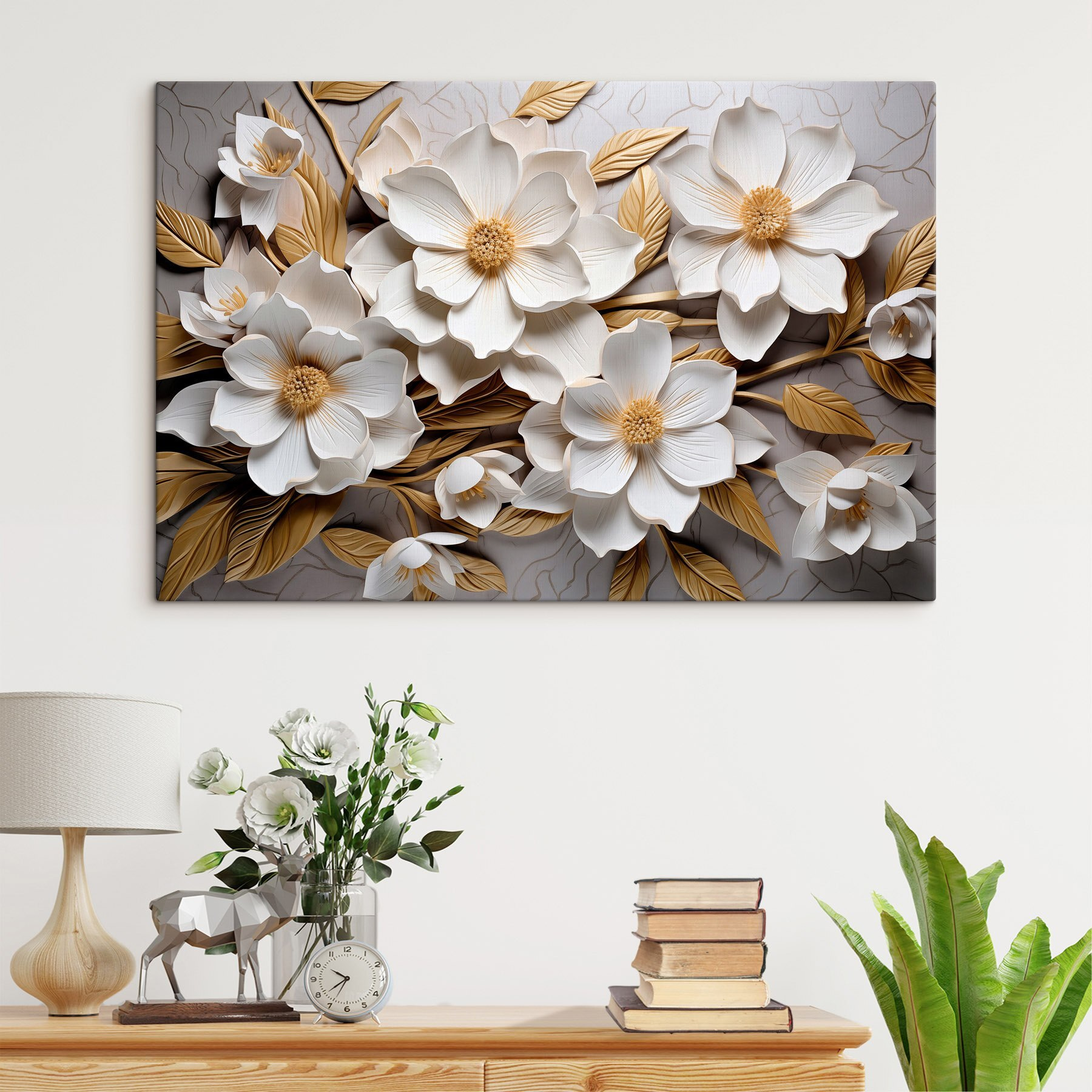 Înveseliți orice cameră cu această imprimare fermecătoare pe pânză, cu un grup încântător de flori albe și accente de frunze. Este ca și cum ai avea o mică grădină chiar pe perete – fără udare și fără gândaci enervanți! Culorile suave și elegante vor adăuga un strop de prospețime, făcând spațiile să se simtă calde și primitoare. Imaginați-vă sorbind cafea sau relaxându-vă cu o carte sub privirea ei blândă. Este perfectă pentru cei care adoră frumusețea naturii, dar care nu au un deget verde. Adăugați un strop de bucurie florală în casa dvs. și observați cum vă transformă vibrația. Cui nu-i place un pic de decor vesel?