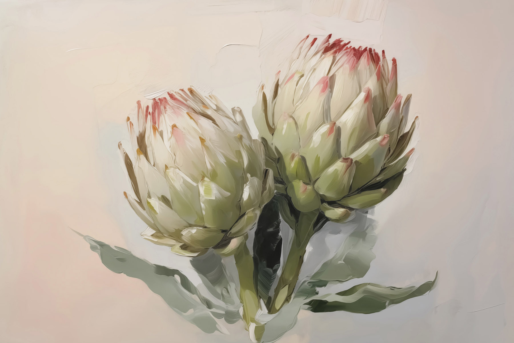 Adăugați un strop de farmec oricărui spațiu cu această imprimare încântătoare pe pânză cu anghinare pe un fundal alb moale. Este ca și cum ai aduce o bucățică de natură în interior, amintindu-le tuturor că frumusețea poate fi găsită în cele mai neașteptate locuri. Imaginați-vă că vă relaxați în camera de zi, sorbind ceai și lăsând culorile subtile ale acestei lucrări de artă să vă inspire vise cu ochii deschiși la grădini însorite și aventuri culinare. Este perfect pentru oricine iubește decorul unic care spune o poveste. În plus, anghinarele sunt cunoscute pentru inimiozitatea lor, ceea ce face ca această piesă să stârnească conversații. Cine ar fi crezut că legumele pot fi atât de elegante?