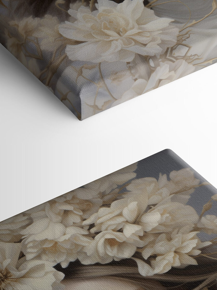 Transformați orice cameră cu această imprimare încântătoare pe pânză, care prezintă o femeie împodobită cu o coroană de flori. Amestecul de culori suave și flori delicate adaugă o notă de grație și fantezie spațiului tău. Imaginează-ți că treci pe lângă ea și te simți puțin înălțat, ca și cum natura ți-ar șopti noutăți dulci chiar în sufrageria ta. Perfectă pentru un colț confortabil sau ca piesă statement, această operă de artă aduce un vibe liniștit care te face să te oprești și să respiri. Este ca o mică grădină înfășurată într-un portret – gata să aducă un strop de magie în casa ta.