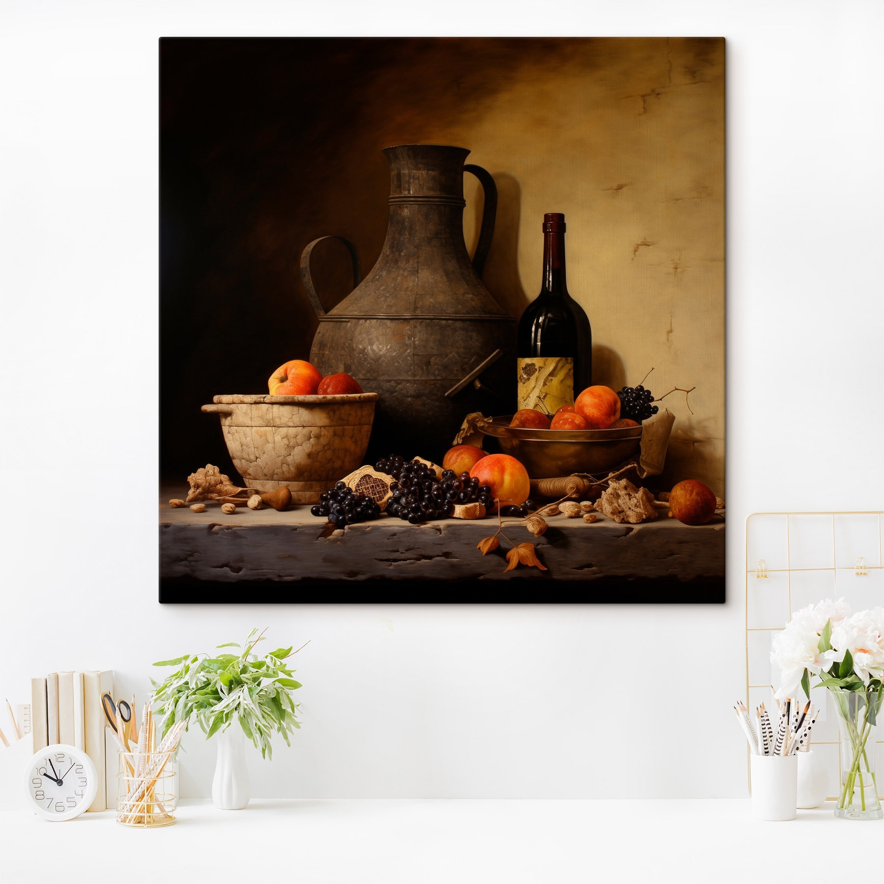 Transformați-vă spațiul cu o atingere de farmec rustic. Această imprimare pe pânză, care prezintă o natură moartă încântătoare de fructe vibrante și o sticlă confortabilă, invită la căldură și o notă de nostalgie. Imaginați-vă această piesă agățată în bucătărie sau în zona de luat masa, stârnind conversații la masă. Este ca și cum ai avea o piață a fermierilor în miniatură chiar la tine acasă, fără albine și pământ! Tonurile pământii creează o atmosferă reconfortantă, perfectă pentru serile confortabile cu un pahar de vin. Perfect pentru iubitorii de mâncare sau pentru oricine dorește să adauge un strop de viață pereților săi. Este mai mult decât un simplu decor; este o experiență care așteaptă să se întâmple!