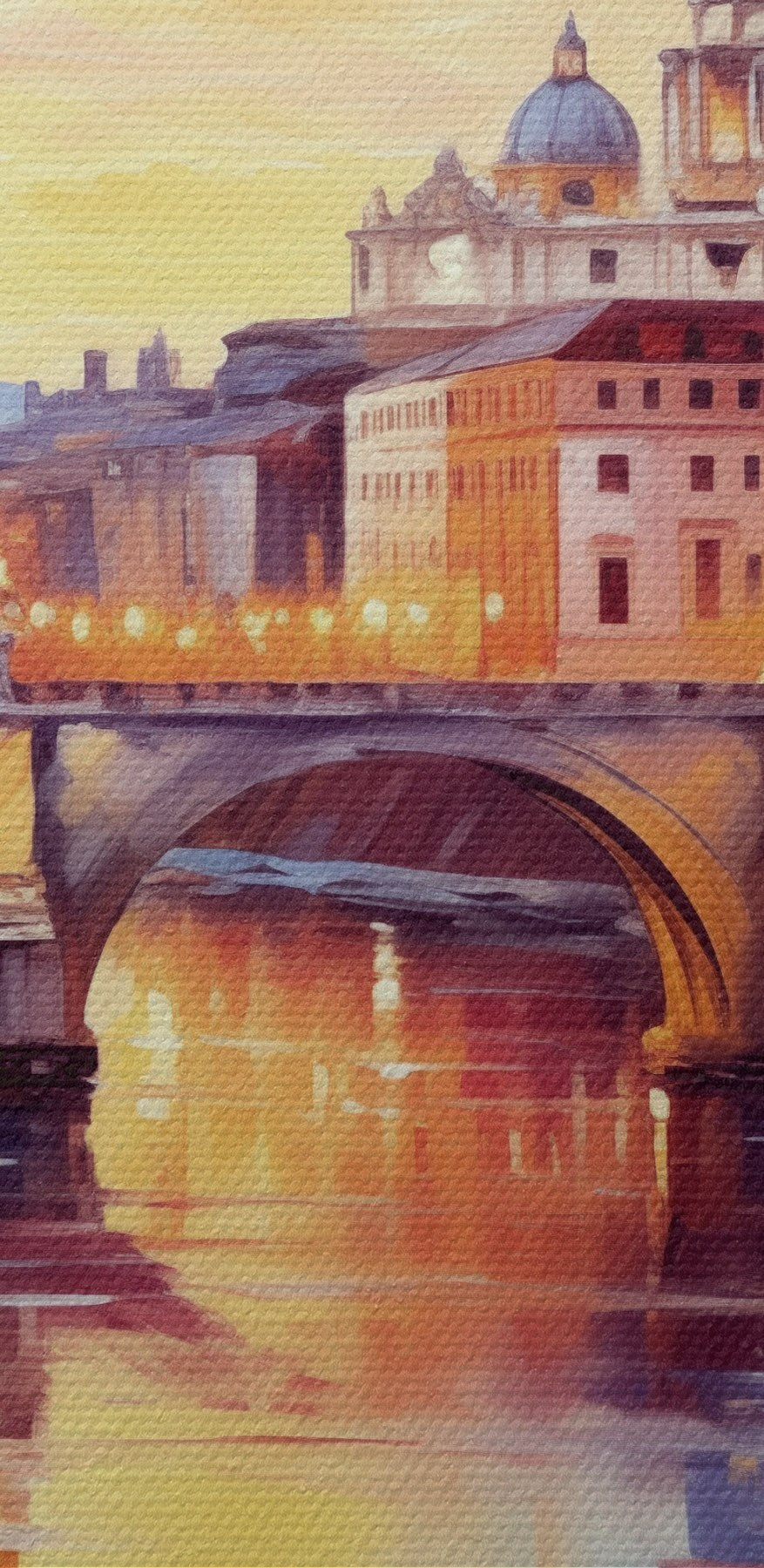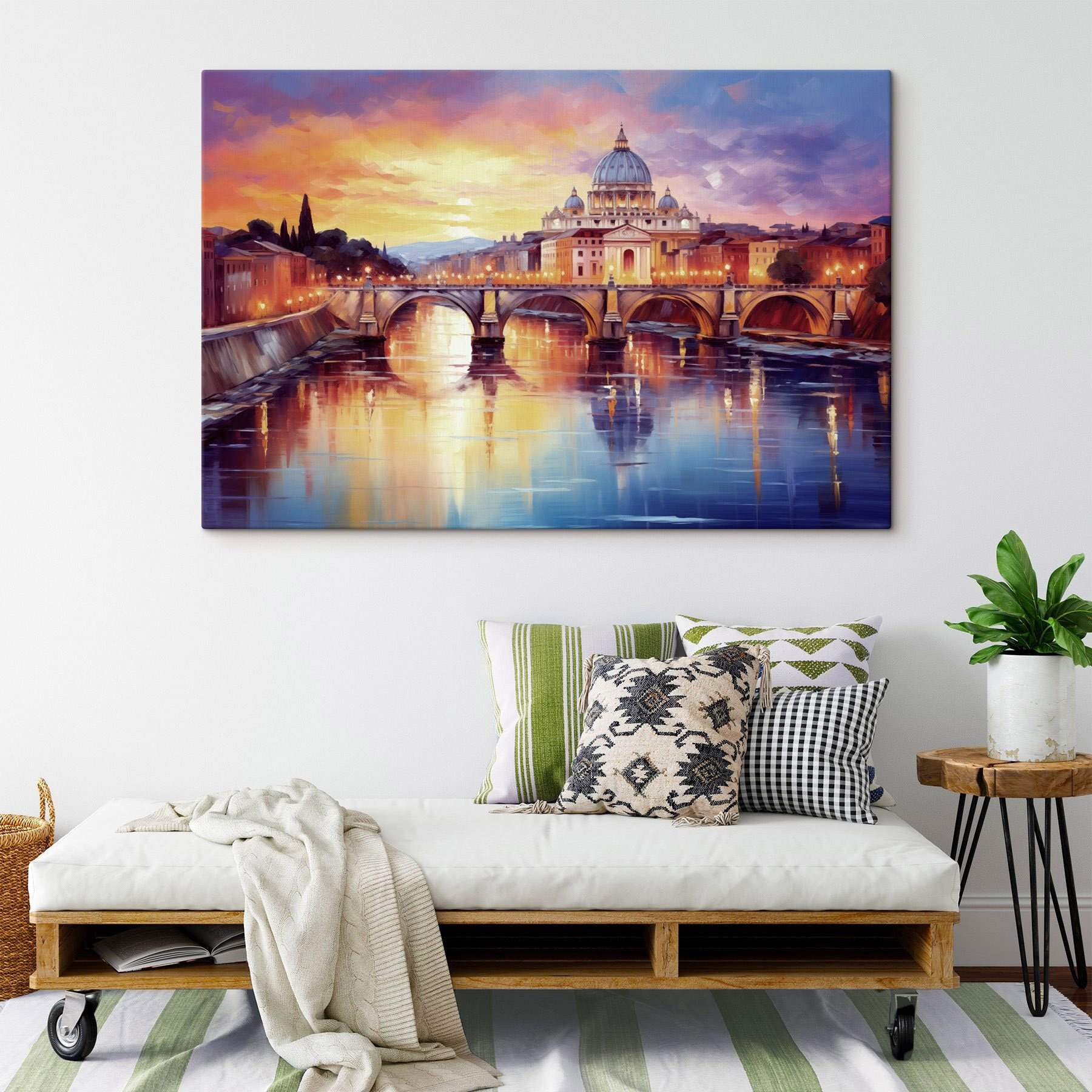 Imaginați-vă o seară liniștită pe malul râului cu această imprimare uimitoare pe pânză, care conferă căldură și farmec oricărui spațiu. Un pod se întinde grațios peste apă, reflectând nuanțele apusului de soare, în timp ce o clădire maiestuoasă stă drept santinelă în fundal. Este ca și cum ai invita o parte din magia călătoriei direct în casa ta. Perfectă pentru colțuri confortabile sau pentru acel perete gol care cere atenție, această operă de artă șoptește povești despre aventuri și momente liniștite deopotrivă. Prietenii s-ar putea să zăbovească puțin mai mult, pierduți în gânduri, în timp ce savurează scena splendidă. Cine nu și-ar dori o doză zilnică de escapism visător?