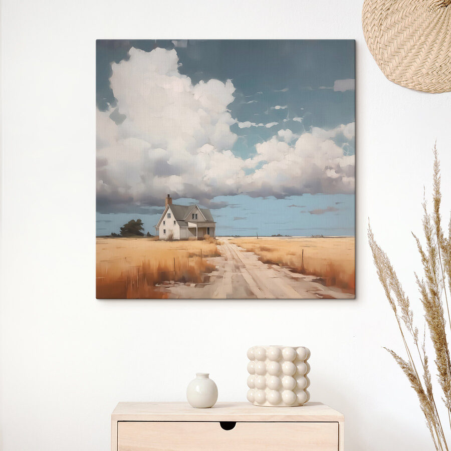 Imaginați-vă că vă treziți în fiecare zi la vederea unei case fermecătoare cuibărită într-un câmp auriu sub un cer de vis, plin de nori. Această imprimare pe pânză aduce această vibrație senină chiar în spațiul dvs., făcând-o punctul focal perfect pentru orice cameră. Este ca o gură de aer proaspăt de la țară, invitând acele sentimente confortabile, relaxate. Imaginați-vă sorbindu-vă cafeaua de dimineață în timp ce vă pierdeți în cerul larg și în legănarea blândă a ierbii aurii. Nu este doar artă; este o stare de spirit, o mică evadare din agitația vieții. Perfectă pentru a adăuga căldură și caracter, această piesă îi va face pe oaspeți să întrebe unde ați găsit o astfel de bijuterie unică. Un pic de natură, un pic de nostalgie și o mulțime de farmec – ce nu este de iubit?