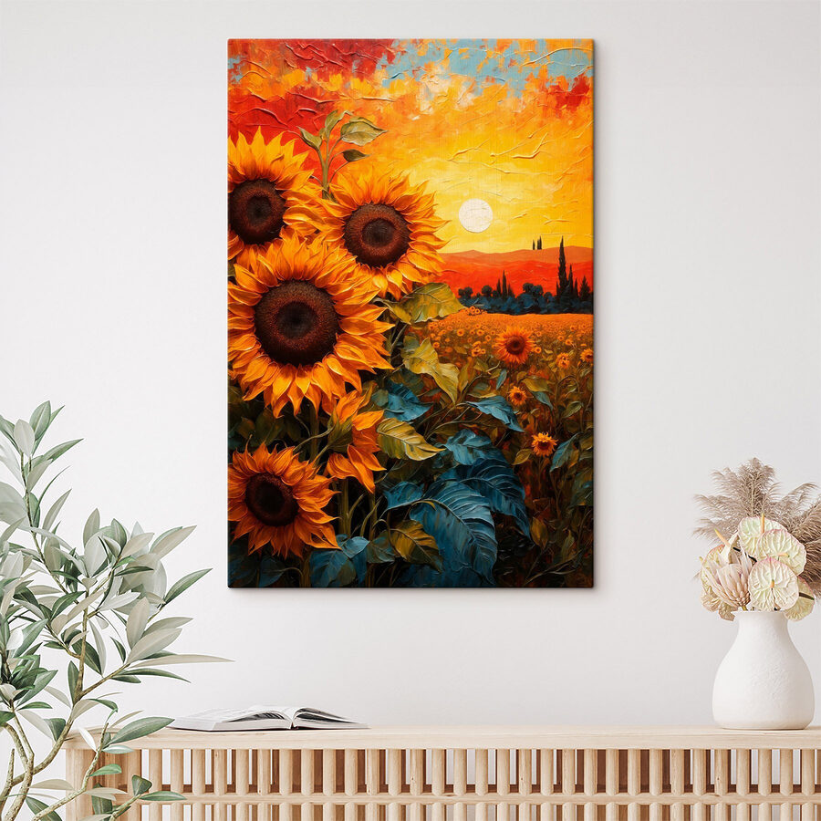 Înveseliți orice spațiu cu această imprimare uimitoare pe pânză cu floarea-soarelui care se scaldă într-un câmp auriu. Imaginați-vă că intrați într-o cameră și ele sunt acolo, vesele și îndrăznețe, amintind tuturor că există frumusețe în natură! Galbenul cald și verdele intens sunt ca o îmbrățișare pentru ochi. Este perfect pentru un colț confortabil sau pentru a anima acel perete care se simte un pic singur. În plus, stârnește conversații – cui nu-i plac florile soarelui? Momentele petrecute aici vor fi un pic mai fericite, ca și cum v-ați bucura de un picnic însorit după-amiază.