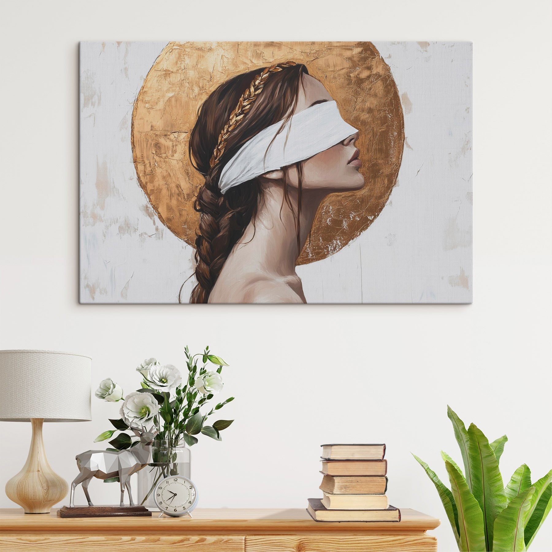 Această imprimare captivantă pe pânză prezintă o femeie legată la ochi, emanând un aer de mister și grație. Nuanțele suave și liniile delicate vă invită să vă gândiți la povestea ei – ce se ascunde în spatele acelor ochi închiși? Plasarea acestei opere de artă în spațiul dvs. ar putea transforma complet atmosfera, făcând-o un punct de discuție pentru prieteni și familie. Imaginați-vă-o luminând un colț de lectură confortabil sau stârnind conversații într-o cameră de zi plină de viață. Este combinația perfectă de eleganță și enigmă, o frumoasă amintire a faptului că, uneori, misterul este locul unde se află magia!