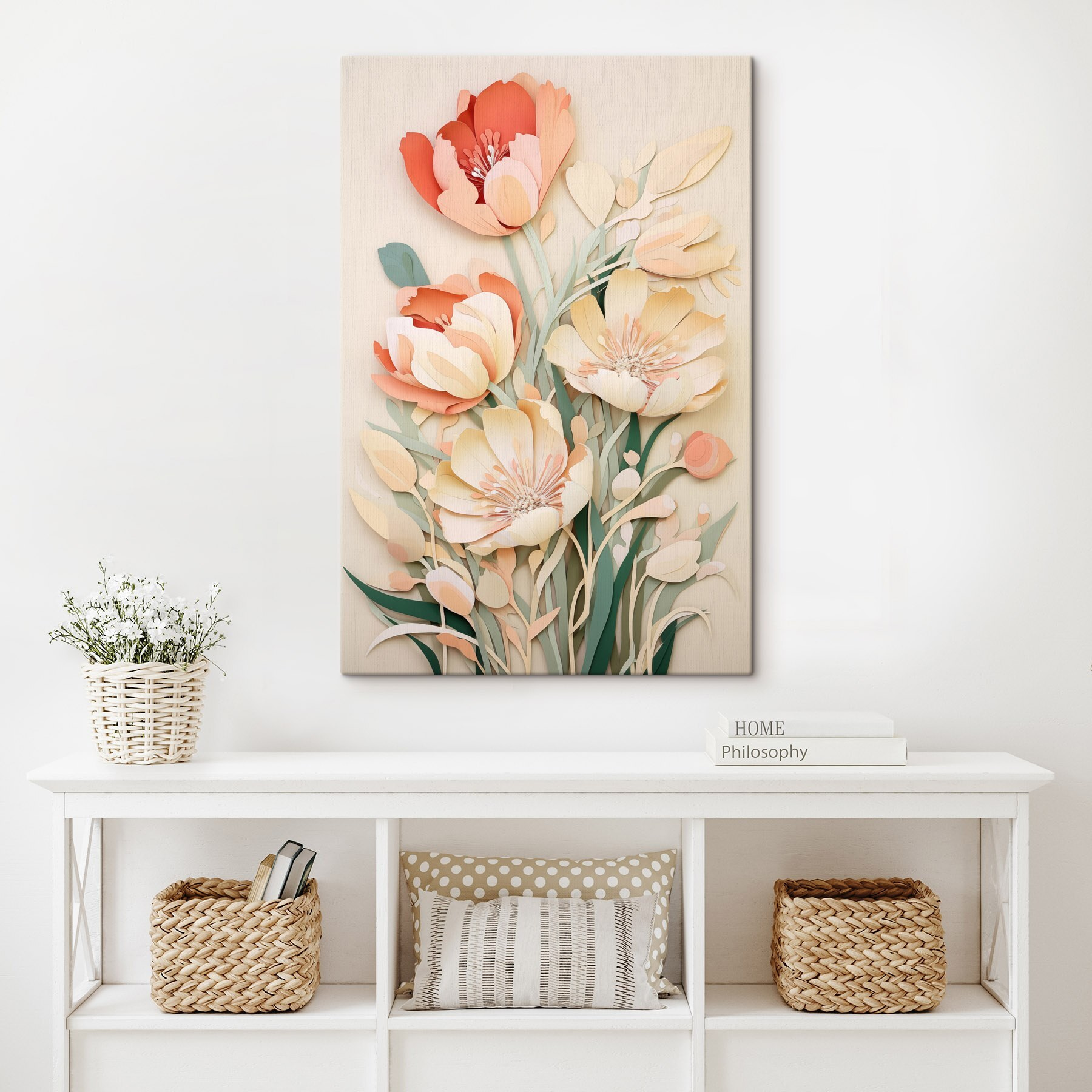 Transformați orice spațiu cu această imprimare încântătoare pe pânză, prezentând flori frumoase decupate din hârtie care aduc o notă de natură în interior. Imaginați-vă că intrați în camera dvs. și simțiți un val de calm, în timp ce aceste flori vibrante dansează pe perete, șoptindu-vă vibrații de primăvară pe tot parcursul anului. Perfecte pentru a decora un living sau pentru a adăuga o notă jucăușă unui dormitor, este ca și cum ai avea o grădină personală, fără a fi nevoit să o uzi. Prietenii se vor întreba cum reușiți să obțineți un astfel de farmec fără efort. Nu este doar decor; este o invitație să vă opriți și să mirosiți – sau, în acest caz, să admirați – florile.