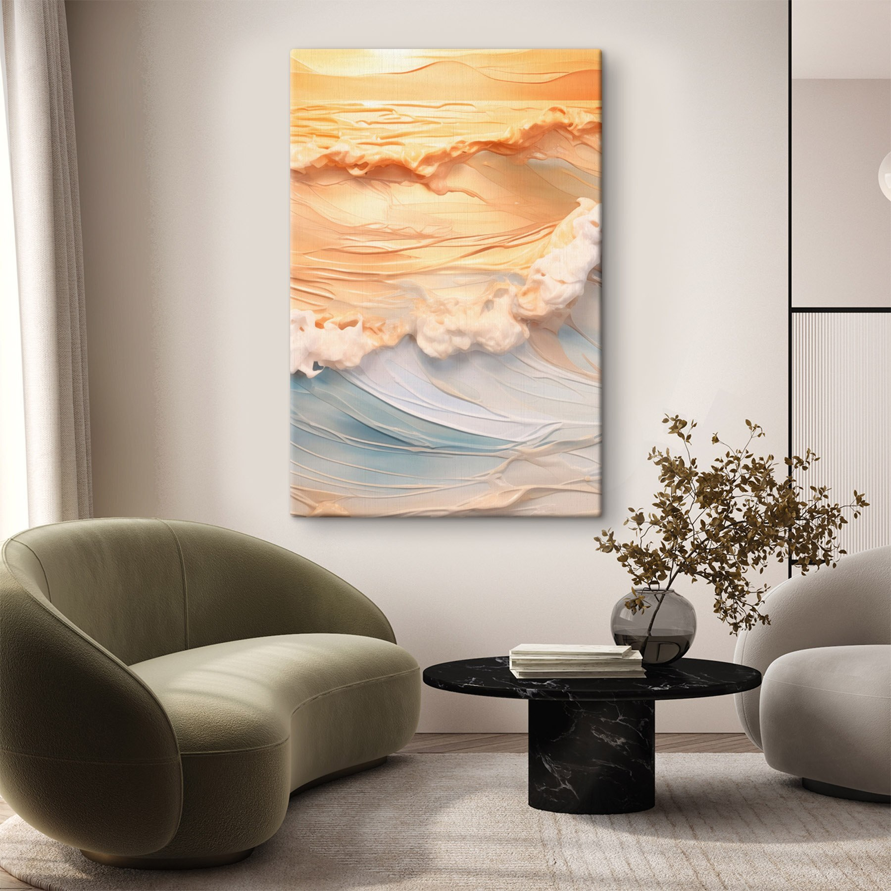 Imaginați-vă că pășiți într-o cameră în care valurile blânde și nuanțele calde vă învăluie ca o pătură confortabilă. Această imprimare pe pânză, “Valurile moi îmbrățișează nuanțe calde și liniștite”, face exact asta. Este ca și cum ai aduce o zi senină de plajă direct pe pereții tăi – nu este nevoie de protecție solară! Culorile blânde se îmbină perfect, invitând la vibrații pașnice în timp ce stârnesc visuri cu ochii deschiși la după-amiezele leneșe de pe țărm. Perfectă pentru o cameră de zi sau chiar pentru un dormitor liniștit, această piesă transformă orice spațiu într-o oază liniștitoare. Nu este doar artă; este un memento pentru a îmbrățișa micile momente de bucurie și liniște din viața de zi cu zi. Acum, cine nu și-ar dori asta?