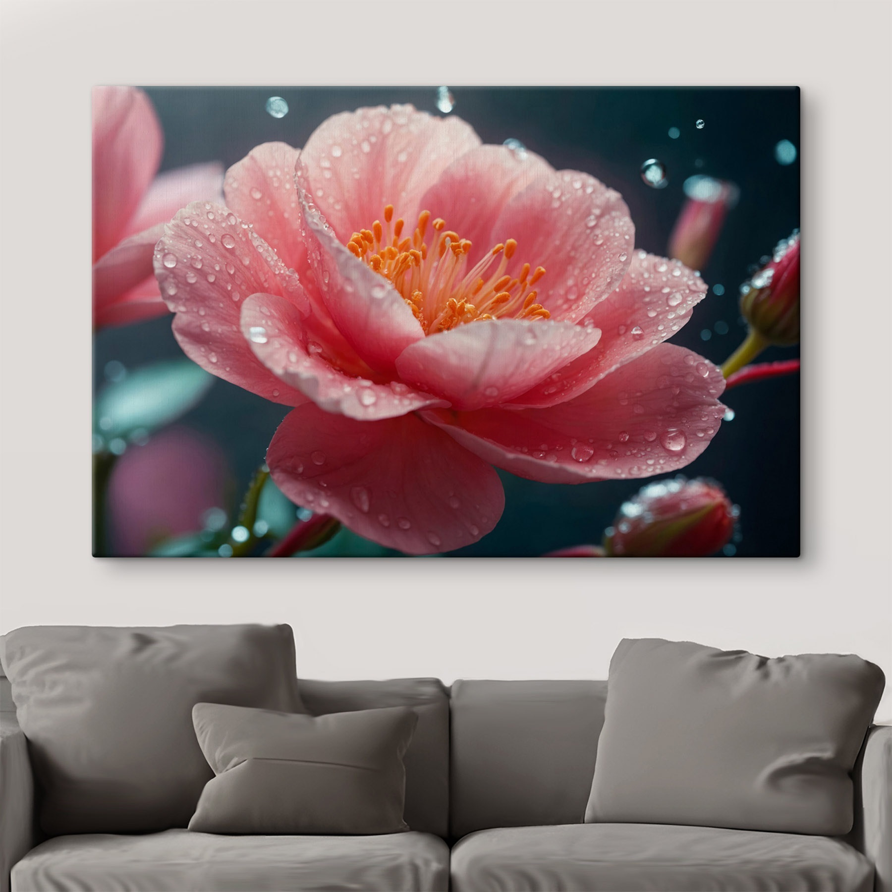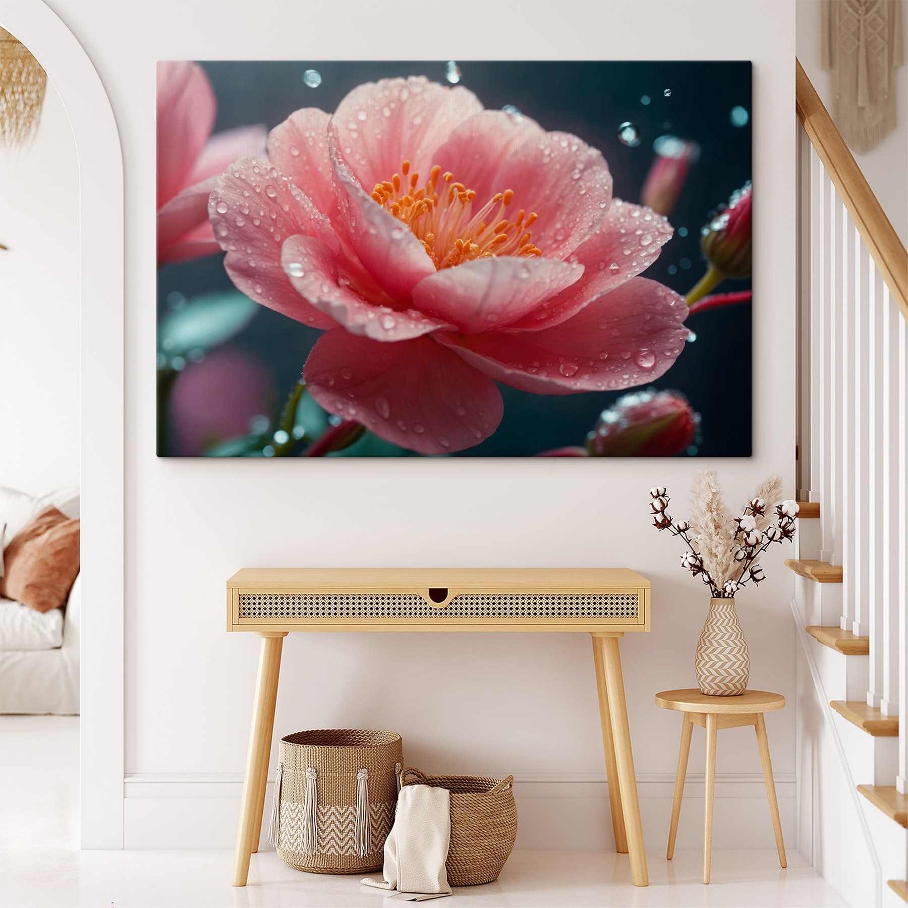 Imaginați-vă că pășiți într-o grădină liniștită după o ploaie blândă – această imprimare pe pânză surprinde exact acel moment. Cu petale delicate udate de picături, există o anumită prospețime care luminează instantaneu o cameră. Este ca și cum ai aduce un pic de natură în interior, exact acolo unde îi este locul. Agățați-o în camera de zi pentru discuții ocazionale sau într-un colț confortabil pentru ceașca perfectă de ceai. Prietenii s-ar putea chiar să se oprească să o admire, stârnind povești despre florile preferate și zilele pline de soare. Este mai mult decât un decor; este o mică sărbătoare a frumuseții și a vieții. Cine nu și-ar dori o mică amintire a măiestriei naturii?