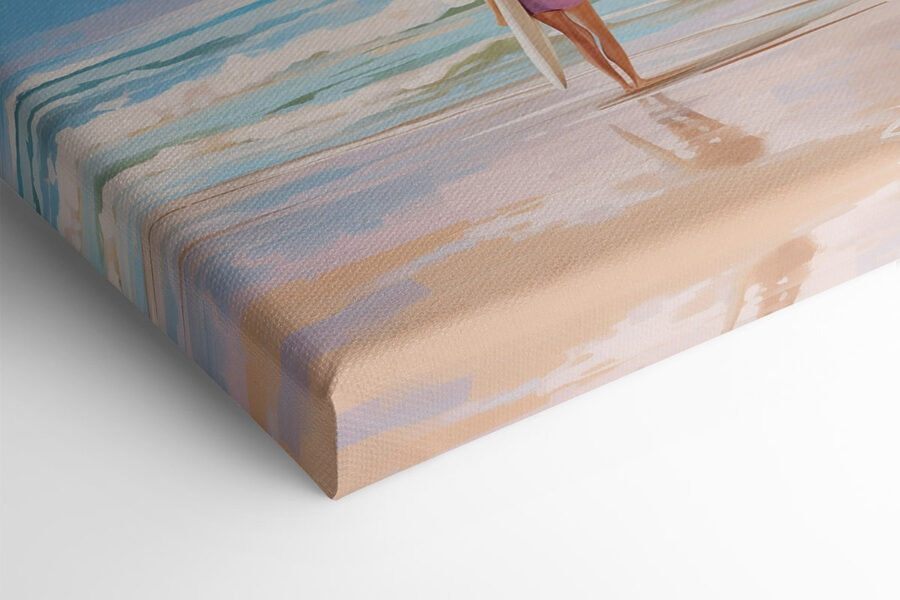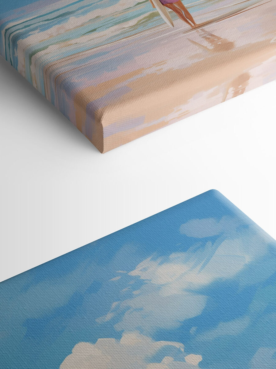Imaginează-ți asta: soarele îți încălzește pielea, sunetul valurilor care se sparg umple aerul, iar acolo este o fată cu o placă de surf, pregătită pentru o aventură. Acest print pe pânză surprinde această atmosferă de plajă fericită. Este ca o fereastră spre paradis chiar pe peretele tău. Albastrul moale și norii blânzi te atrag înăuntru, făcând orice cameră să se simtă aerisită și relaxată. Imaginați-vă că găzduiți o reuniune, iar invitații nu pot decât să viseze cu ochii deschiși la țărmurile nisipoase și la distracția de vară. Este mai mult decât un simplu decor; este o amintire a acelor zile însorite. Perfect pentru a înveseli orice colț – cine nu și-ar dori o atingere de ocean în viața sa?