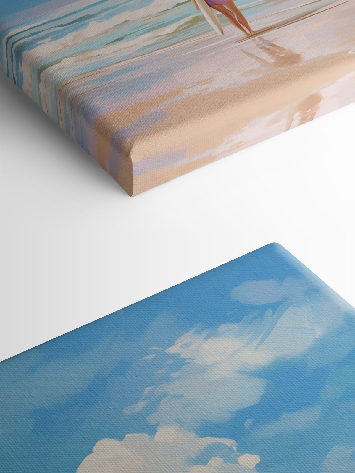 Imaginează-ți asta: soarele îți încălzește pielea, sunetul valurilor care se sparg umple aerul, iar acolo este o fată cu o placă de surf, pregătită pentru o aventură. Acest print pe pânză surprinde această atmosferă de plajă fericită. Este ca o fereastră spre paradis chiar pe peretele tău. Albastrul moale și norii blânzi te atrag înăuntru, făcând orice cameră să se simtă aerisită și relaxată. Imaginați-vă că găzduiți o reuniune, iar invitații nu pot decât să viseze cu ochii deschiși la țărmurile nisipoase și la distracția de vară. Este mai mult decât un simplu decor; este o amintire a acelor zile însorite. Perfect pentru a înveseli orice colț – cine nu și-ar dori o atingere de ocean în viața sa?