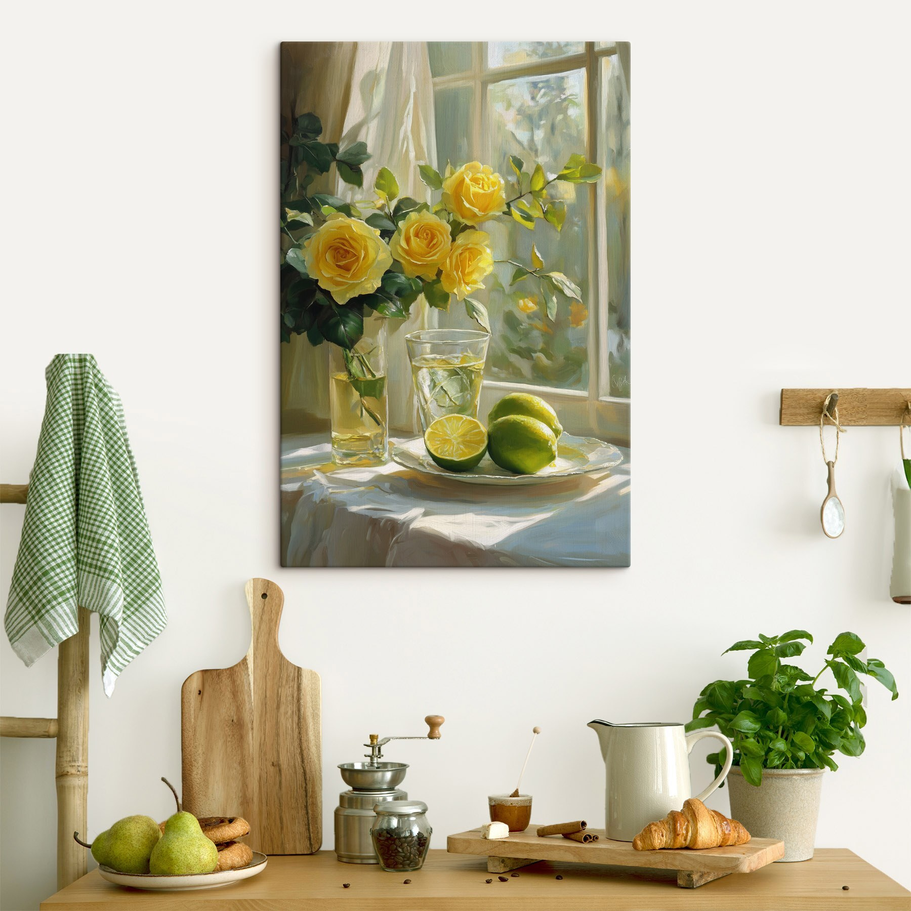 Înveseliți orice spațiu cu această pânză încântătoare cu trandafiri galbeni și lămâi zemoase pe o farfurie. Este ca o după-amiază plină de soare prinsă pe un perete! Imaginați-vă că vă plimbați pe acolo și că aruncați o privire asupra acestor flori vesele – parfumul lor blând aproape că plutește în aer, lăsându-vă să vă simțiți un pic mai ușor. Galbenul vibrant și verdele proaspăt pot aduce o notă de culoare în orice cameră. Perfectă pentru o bucătărie sau o zonă de luat masa, este o amintire prietenoasă a bucuriilor mai simple – flori proaspete, băuturi răcoritoare și acele mici momente care fac viața dulce. Cine nu și-ar dori un pic mai mult soare în ziua sa?