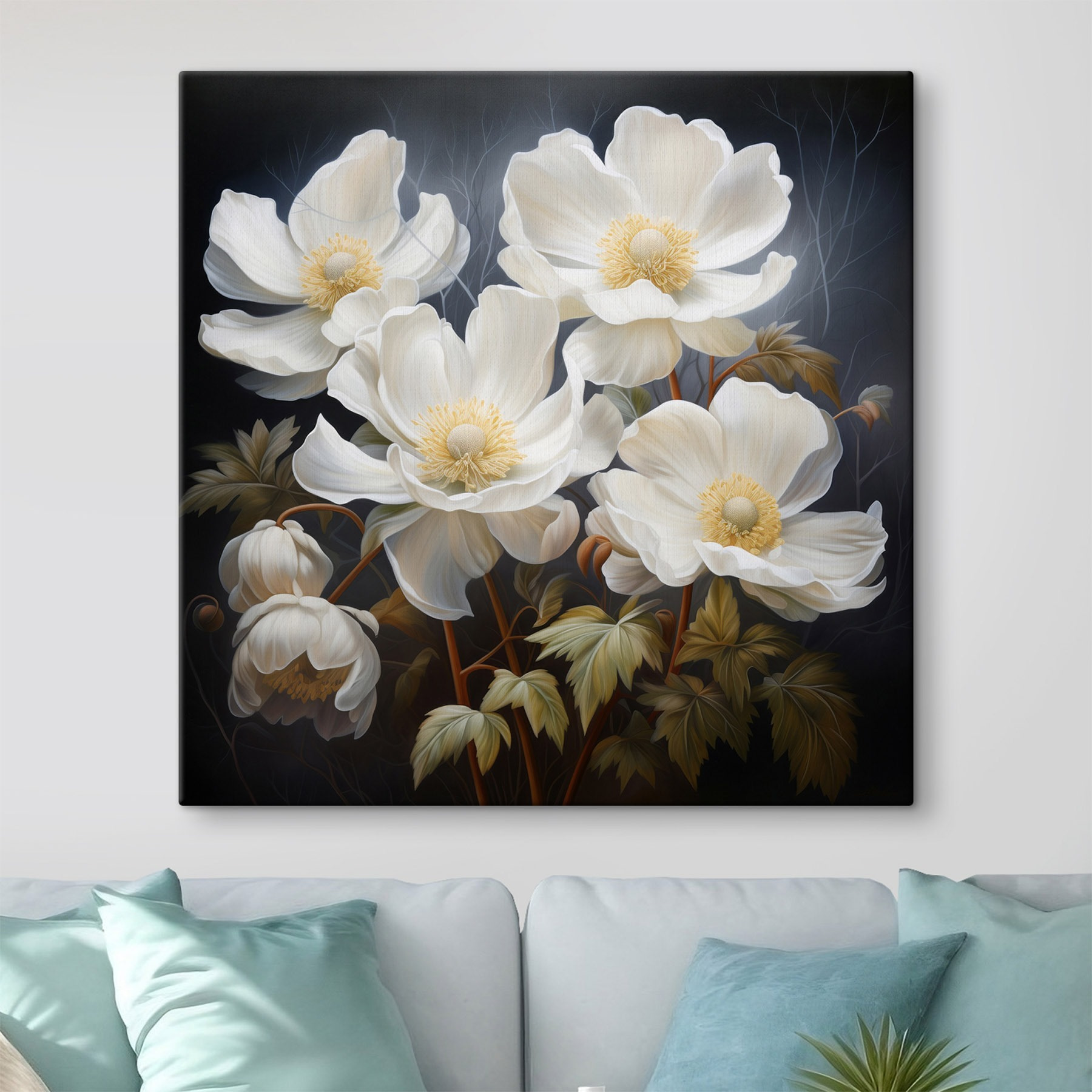 Îmbrățișați o gură de aer proaspăt cu această imprimare uimitoare pe pânză cu flori albe frumoase. Fiecare floare pare să danseze pe pânză, invitând un sentiment de calm și seninătate în orice spațiu. Imaginați-vă că treceți pe lângă ea și simțiți că tocmai ați pășit într-o grădină de vis, fără a fi nevoie de degetul mare verde. Fie că se află într-un colțișor de lectură confortabil sau vă luminează camera de zi, această piesă adaugă fără efort farmec și caracter. Este ca și cum ai avea o bucățică de natură în interior – perfect pentru acele zile în care preferi să te bucuri de flori decât să te ocupi de ele. Această operă de artă va stârni cu siguranță conversații și va crea o atmosferă primitoare pentru prieteni și familie.
