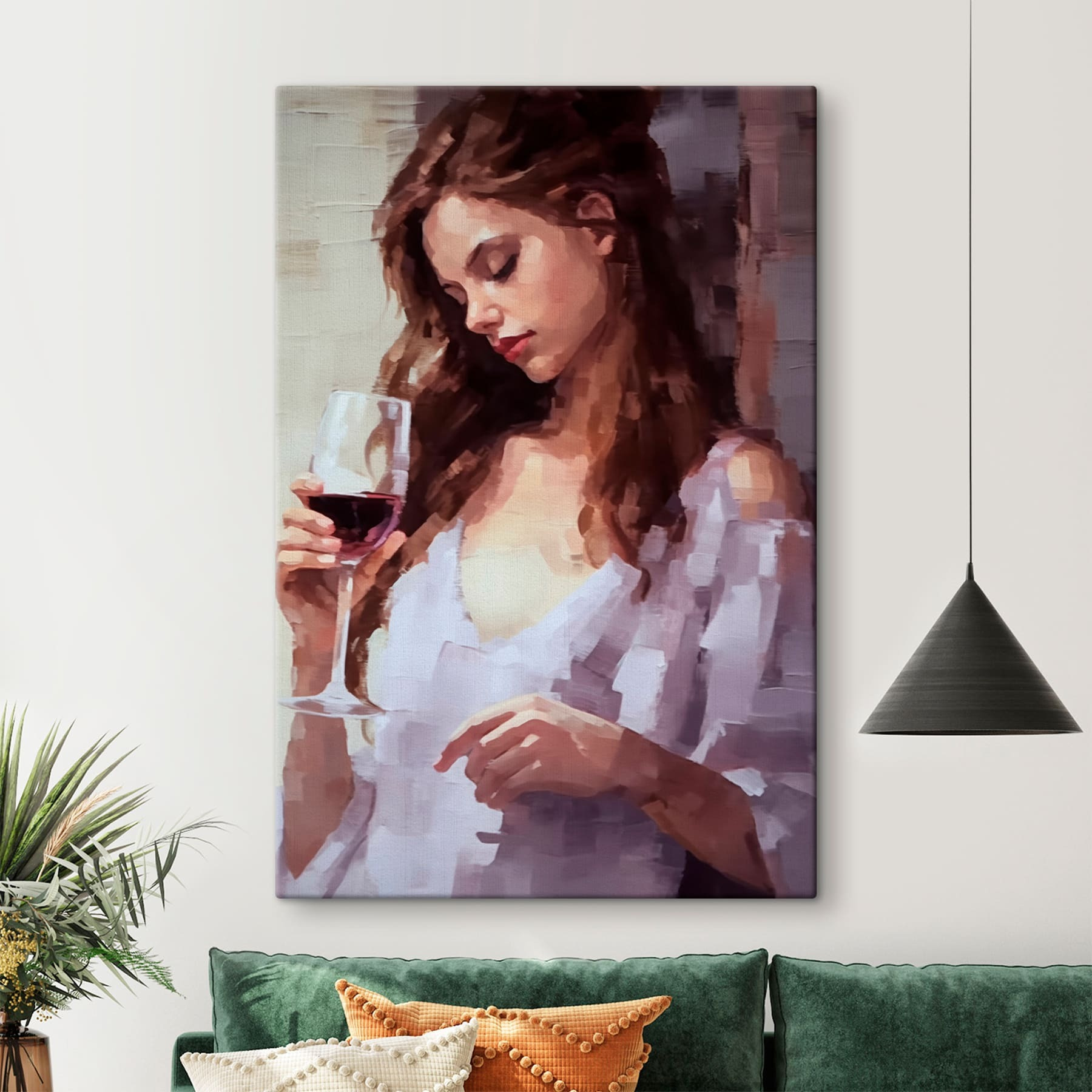 Imaginați-vă asta: o seară confortabilă, o lumină blândă și iat-o – o femeie savurând un moment cu paharul ei de vin roșu. Această imprimare pe pânză surprinde o felie de viață care pare atât intimă, cât și primitoare. Este ca și cum femeia ar fi implicată într-un secret, savurând micile bucurii. Imaginați-vă că agățați acest tablou într-o sufragerie sau într-un colț de lectură, unde fiecare privire la el stârnește un vis frumos cu ochii deschiși. Prietenii te-ar putea întreba de unde este, iar tu ai zâmbi, știind că adaugă o notă de eleganță și căldură. Este mai mult decât artă; este o aluzie la momentele cotidiene și un mic memento pentru a lua viața ușor. Perfect pentru cei care apreciază plăcerile simple.