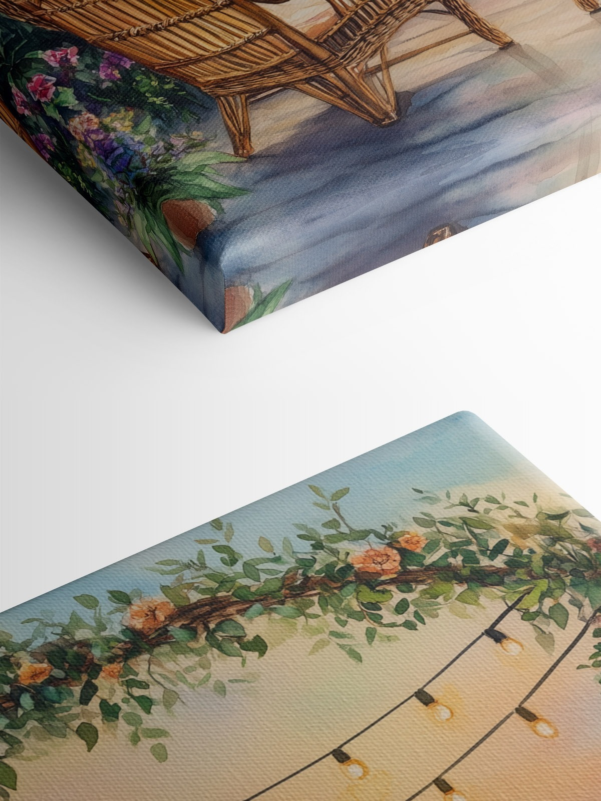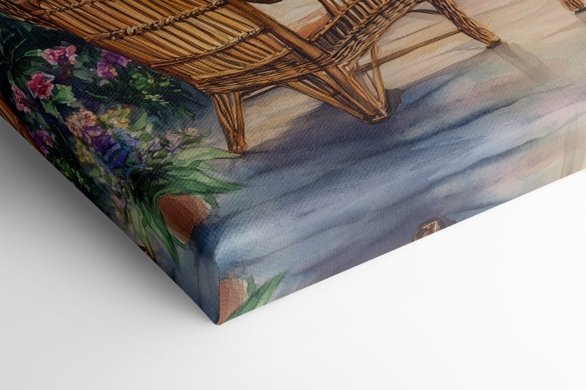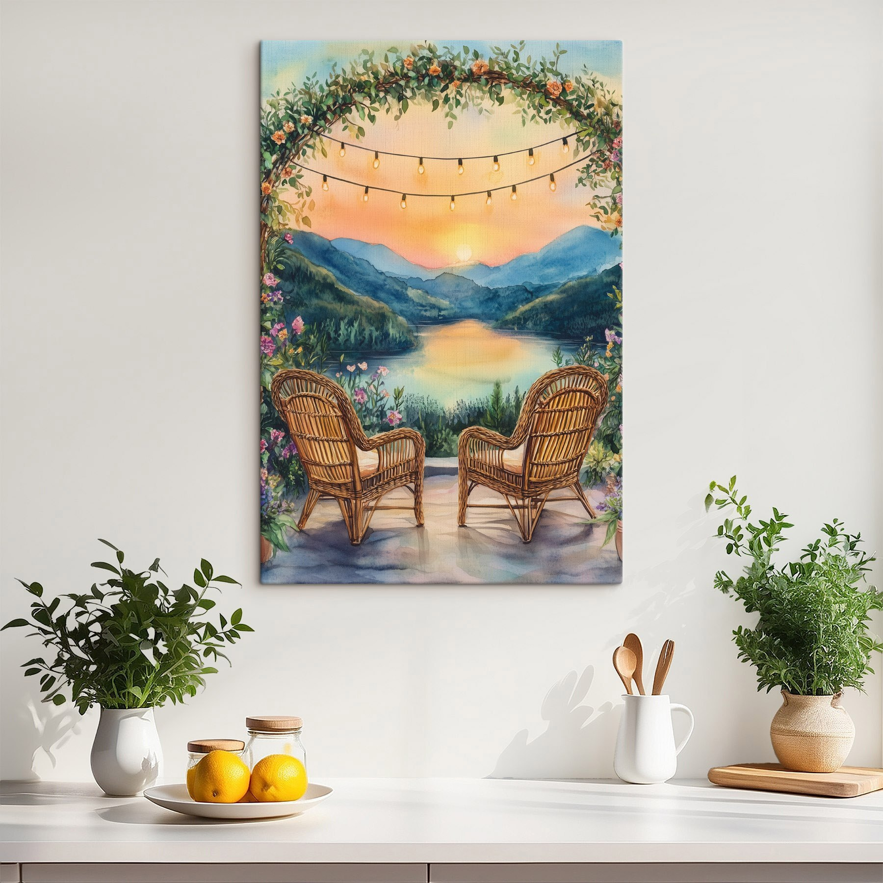 Imaginați-vă că vă relaxați în aceste scaune confortabile, înconjurat de lumini strălucitoare și flori. Acest minunat print pe pânză surprinde acel moment de vis când apusul de soare sărută lacul – un amestec perfect de calm și căldură. Nuanțele suave vă invită să vă relaxați, poate cu o ceașcă de ceai sau o carte bună în mână. Este ca și cum ai aduce o escapadă liniștită chiar în sufrageria ta. Imaginați-vă-o deasupra unui șemineu sau pe un perete confortabil, stârnind conversații și visări cu ochii deschiși. Această piesă nu numai că luminează spațiul, dar vă înfășoară într-o mică felie de liniște, făcând din fiecare privire o amintire blândă a magiei naturii.