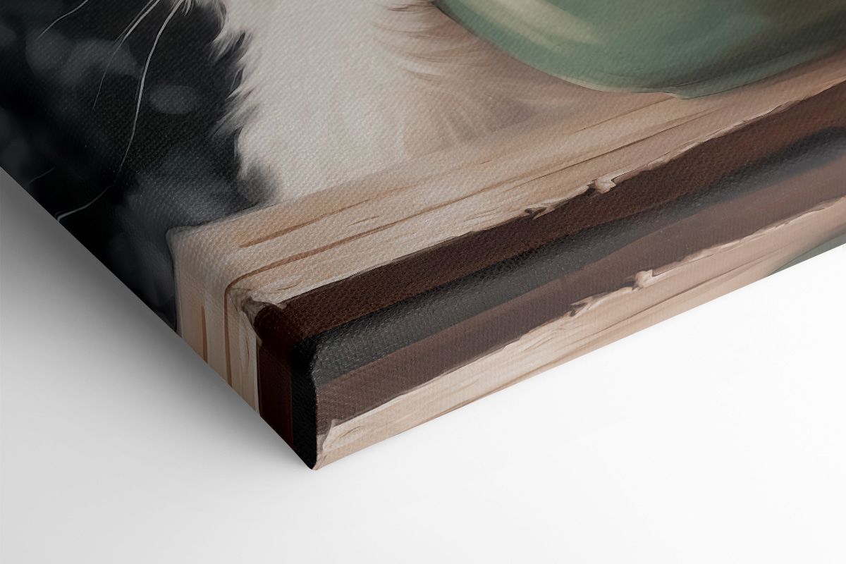 Faceți cunoștință cu încântătoarea imprimare pe pânză cu o pisică adorabilă care ține în brațe o cană. Este una dintre acele piese care aduc instantaneu un zâmbet și stârnesc conversația. Imaginați-vă că intrați într-o cameră și sunteți întâmpinați de acei ochi mari și curioși – este ca și cum această pisicuță vă cunoaște toate secretele. Fie că este amplasată într-un colț confortabil sau atârnată deasupra unui bar de cafea, aceasta adaugă o notă de fantezie care poate lumina ziua oricui. Perfect pentru iubitorii de pisici sau pentru oricine are nevoie de o mică doză de drăgălășenie, acest print poate face chiar și o dimineață de luni să se simtă puțin mai specială. Ca să nu mai vorbim de faptul că este un memento blând pentru a lua o pauză, a sorbi niște cafea și a te bucura de lucrurile mărunte.