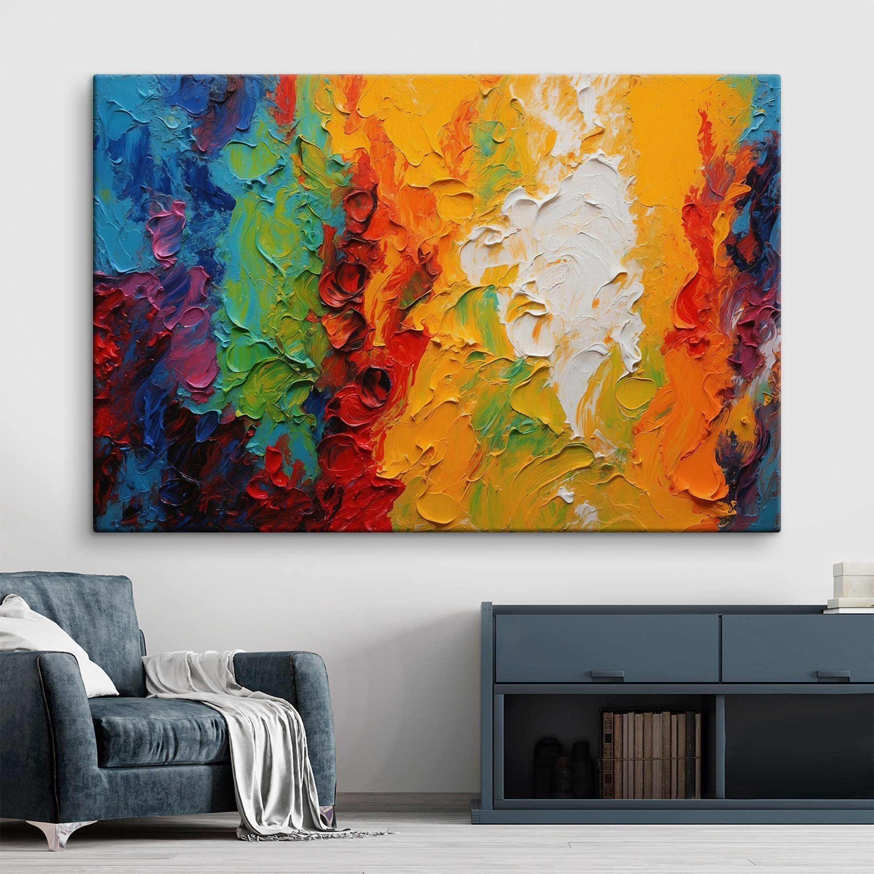 Înveseliți orice cameră cu această imprimare pe pânză vibrantă. Explodând cu vârtejuri de culoare, este ca o petrecere de dans veselă pentru pereții dvs.! Imaginați-vă că intrați în spațiul dvs. și sunteți întâmpinați de stropi de roșu energic, galben vesel și albastru liniștitor. Această piesă nu doar atârnă acolo – invită la conversație, stârnește creativitatea și face ca fiecare zi să pară puțin mai specială. Perfectă pentru camere de zi, colțuri de artă sau oriunde este nevoie de puțină vitalitate. Este ca un strop de soare într-o zi înnorată – garantat va aduce zâmbete și poate chiar un chicotit sau două.
