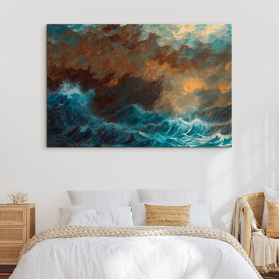 Captați spiritul oceanului cu această imprimare uimitoare pe pânză a valurilor care se izbesc de țărm. Este ca și cum ai aduce o bucată de plajă chiar în sufrageria ta – cine trebuie să plece în vacanță? Albastrul vibrant și modelele dinamice evocă sentimentul răcoritor al unei brize marine sărate. Imaginați-vă că primiți prieteni și le vedeți fețele luminându-se pe măsură ce observă culorile învolburate. Adaugă un aer de liniște și bucurie oricărui spațiu, perfect pentru relaxare după o zi lungă. Imaginați-vă: un fotoliu confortabil, o băutură caldă și amintirea blândă a frumuseții naturii. Această piesă nu doar decorează, ci transportă!