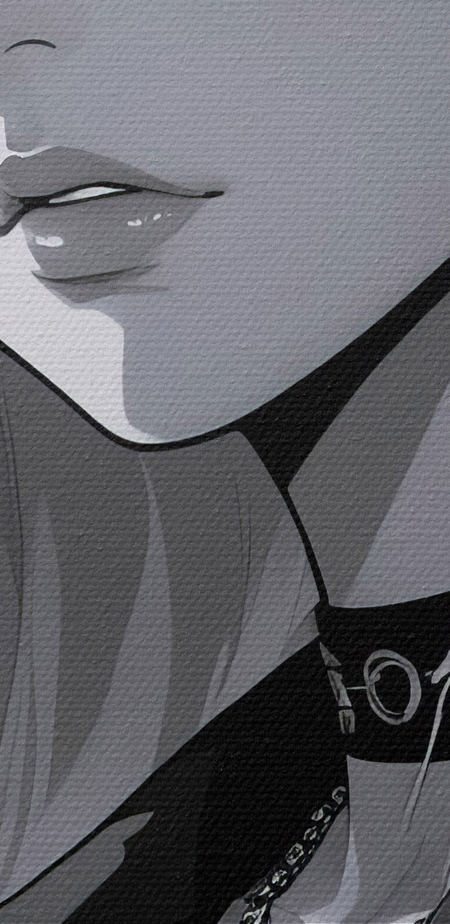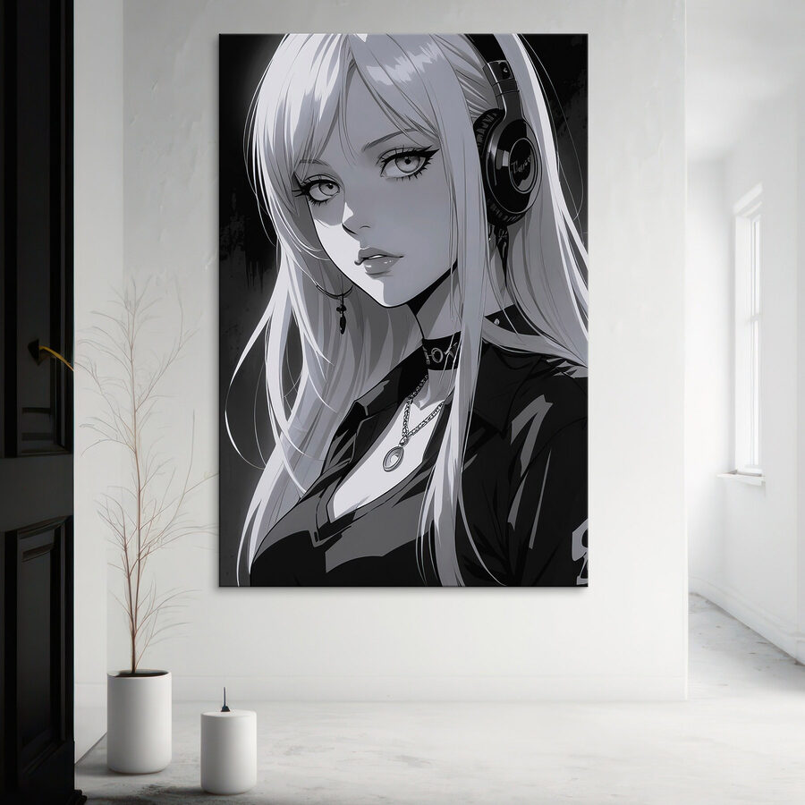 Adăugați un strop de cool spațiului dvs. cu această impresionantă imprimare pe pânză. Acesta înfățișează o femeie captivantă cu păr blond lung și fluid și căști, îmbinând perfect eleganța și o notă de atitudine. Imaginați-vă-o privind peste umărul dvs. în timp ce sorbiți cafeaua, ca și cum ar fi la curent cu toate visele dvs. secrete. Designul alb-negru îi conferă o vibrație atemporală, potrivindu-se în orice cameră, de la o zonă de living șic la un spațiu de lucru creativ. Este ca și cum ai avea o mică piesă de artă care șoptește stil fără să strige după atenție. Perfect pentru oricine apreciază un pic de tupeu în decorul său.