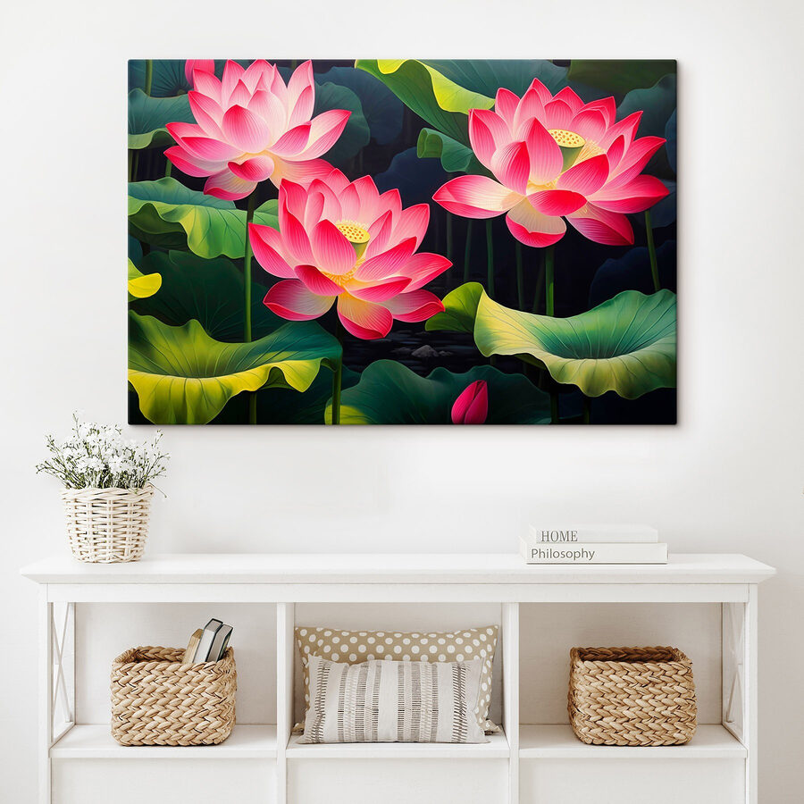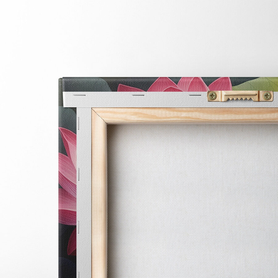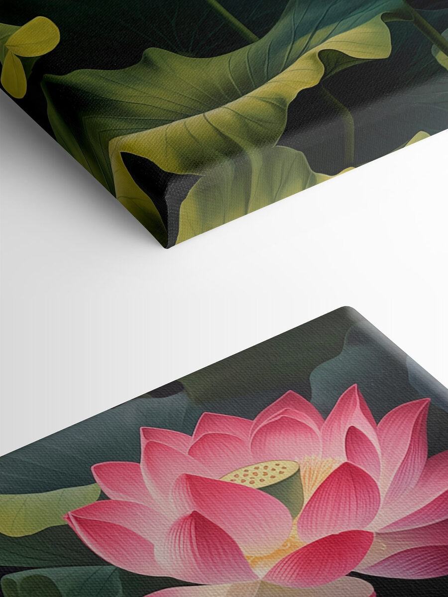 Transformați orice spațiu într-un paradis înflorit cu această imprimare pe pânză vibrantă, care prezintă un grup încântător de flori roz cuibărit printre frunze verzi luxuriante. Este ca și cum ai aduce o bucățică dintr-o grădină încântătoare direct în sufragerie sau în dormitor. Imaginați-vă că vă treziți în fața acestor flori vesele în fiecare zi – dintr-o dată, grămezile de rufe nu mai par atât de înfricoșătoare. Culorile bogate și detaliile delicate invită la sentimente confortabile, făcând din fiecare privire un moment de bucurie. Perfect pentru oricine dorește să își înveselească decorul cu un strop din frumusețea naturii și un zâmbet. Cine nu și-ar dori asta?