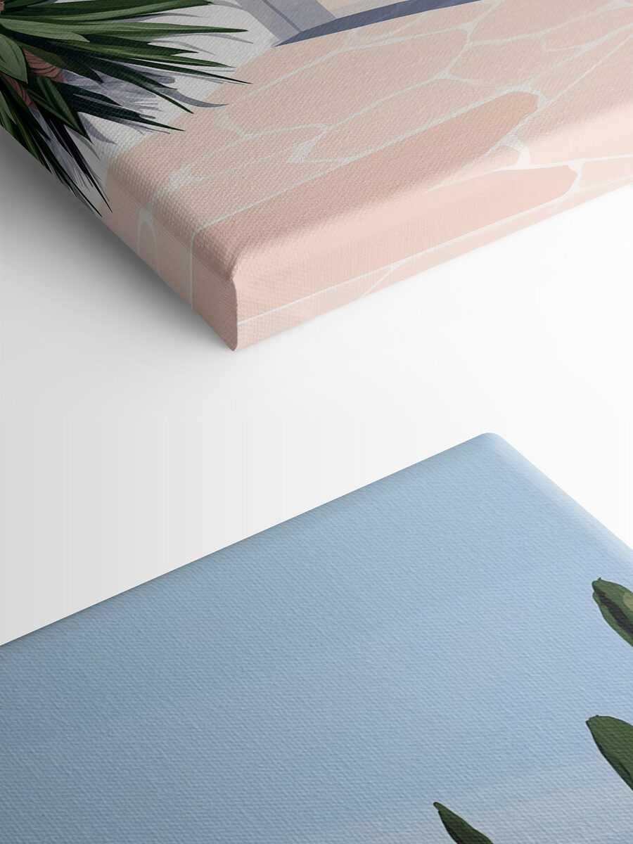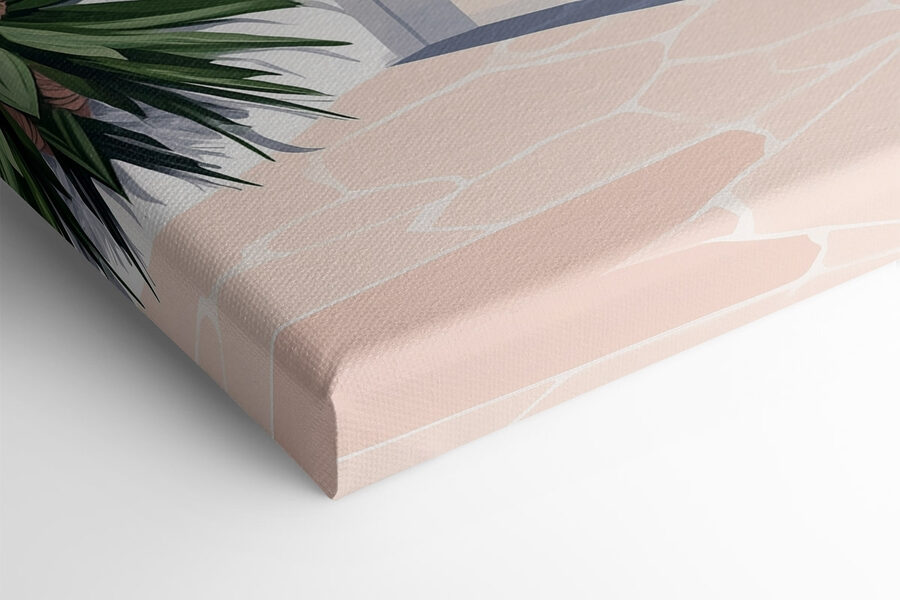 Imaginați-vă că pășiți într-o escapadă însorită, unde aerul este proaspăt și calm. Acest print pe pânză surprinde perfect această vibrație, cu clădirea sa albă izbitoare și arcadele roz blând – ca un fundal perfect pentru o după-amiază de vis. Copacii înalți împrumută o șoaptă de natură, invitând la un sentiment de pace. Agățați-l în camera de zi sau într-un colț confortabil și, dintr-o dată, veți simți că fiecare zi este o mini-vacanță. Prietenii s-ar putea să te întrebe dacă ai călătorit cu avionul, oferindu-ți ocazia să zâmbești și să spui: “Nu, doar îmi trăiesc cea mai frumoasă viață acasă!” Este arta care transformă spațiul, creând o atmosferă caldă, primitoare.