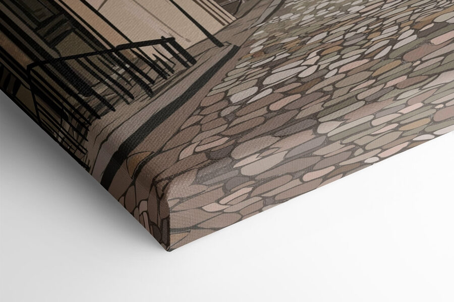 Pășiți într-o lume în care pavelele șoptesc povești din trecut. Această scenă stradală fermecătoare, cu clădirile sale ciudate și stâlpul de iluminat primitor, adaugă o notă caldă oricărei camere. Imaginați-vă că vă relaxați cu o carte bună, aici, scăldat în strălucirea blândă a magiei iluminatului stradal, ca și cum ați fi fost transportat pe o alee europeană capricioasă. Nuanțele subtile se potrivesc perfect cu decorul tău, făcându-l să se simtă atât confortabil, cât și elegant. Perfectă pentru oricine iubește să viseze la locuri îndepărtate, această pictură murală este o amintire încântătoare că aventura vă așteaptă chiar în fața ușii.