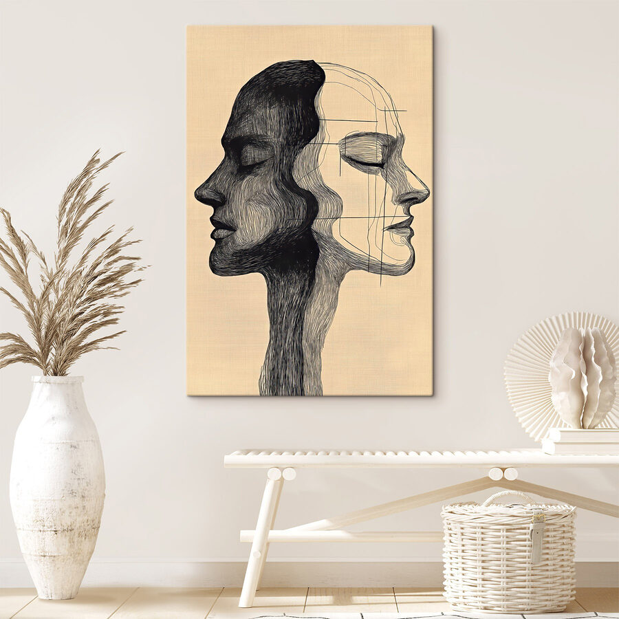 Intrați într-o lume în care arta întâlnește conexiunea cu această imprimare captivantă pe pânză a fețelor unui bărbat și a unei femei. Liniile complicate și contrastele îndrăznețe vă invită să vă gândiți la poveștile din spatele acestor priviri. Nu este doar o decorațiune; este un starter de conversație. Imaginați-vă această piesă pe perete, adăugând farmec serilor confortabile sau întâlnirilor pline de viață. Prietenii s-ar putea simți atrași, împărtășind gânduri și râsete despre ce înseamnă opera de artă pentru ei. Această imprimare dansează între abstracție și emoție, stârnind inspirație în fiecare privire. Perfectă pentru orice loc din casa dvs. – dați o voce pereților!