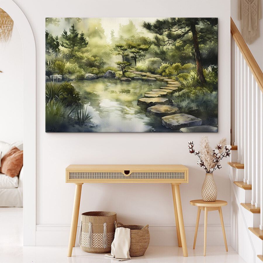 Transformați-vă spațiul cu această pictură fermecătoare în acuarelă a unei poteci senine care duce la un iaz liniștit. Imaginați-vă că alunecați printr-o țară a minunilor din pădure de fiecare dată când o priviți! Verdele moale și albastrul blând creează o atmosferă liniștită, făcându-l perfect pentru un colț de lectură confortabil sau o cameră de zi plină de viață. Imaginați-vă prieteni care se opresc să o admire, spunând că vă simțiți ca și cum ați păși într-o carte de povești. Fiecare tușă vă invită să visați cu ochii deschiși la evadări liniștite, generând un sentiment de calm care vă învăluie ca o pătură confortabilă. Îmbrățișați frumusețea naturii în interior!