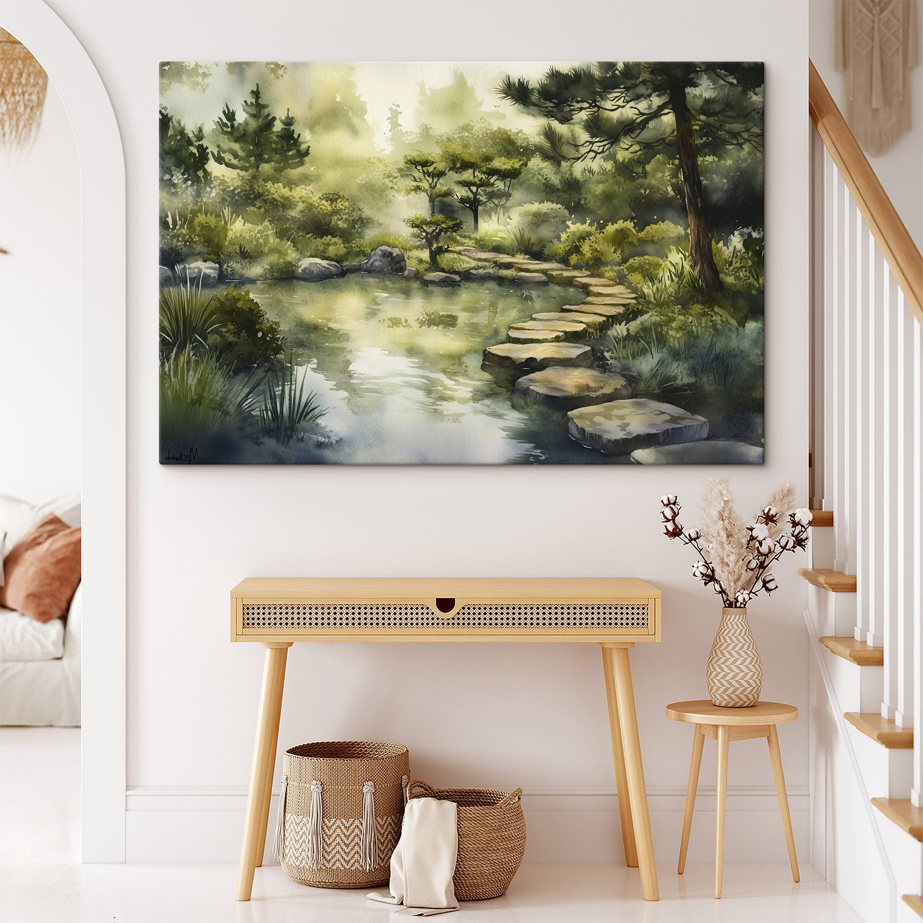 Transformați-vă spațiul cu această pictură fermecătoare în acuarelă a unei poteci senine care duce la un iaz liniștit. Imaginați-vă că alunecați printr-o țară a minunilor din pădure de fiecare dată când o priviți! Verdele moale și albastrul blând creează o atmosferă liniștită, făcându-l perfect pentru un colț de lectură confortabil sau o cameră de zi plină de viață. Imaginați-vă prieteni care se opresc să o admire, spunând că vă simțiți ca și cum ați păși într-o carte de povești. Fiecare tușă vă invită să visați cu ochii deschiși la evadări liniștite, generând un sentiment de calm care vă învăluie ca o pătură confortabilă. Îmbrățișați frumusețea naturii în interior!
