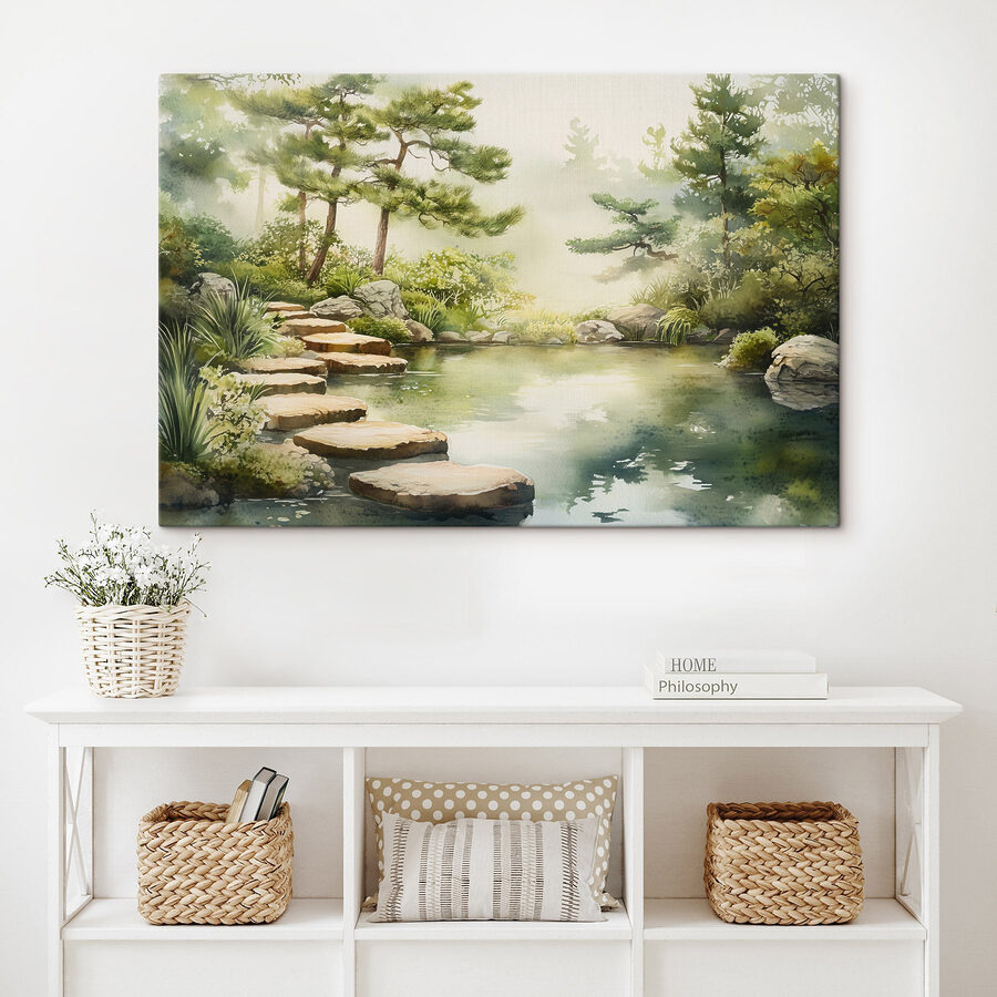 Transformați orice spațiu cu această imprimare captivantă pe pânză cu un iaz senin și o cărare fermecătoare. Imaginați-vă că pășiți în această scenă pașnică în fiecare zi, ca și cum șoaptele naturii vă îndeamnă ușor să luați o pauză. Invitația calmă a apei poate inspira vise cu ochii deschiși sau momente de liniște atât de necesare. Perfectă pentru un colț de lectură confortabil sau deasupra unui spațiu de lucru liniștitor, aceasta adaugă un strop de relaxare. Este ca și cum ai aduce o bucată de grădină japoneză zen chiar în casa ta – cui nu i-ar prinde bine puțină pace în plus?